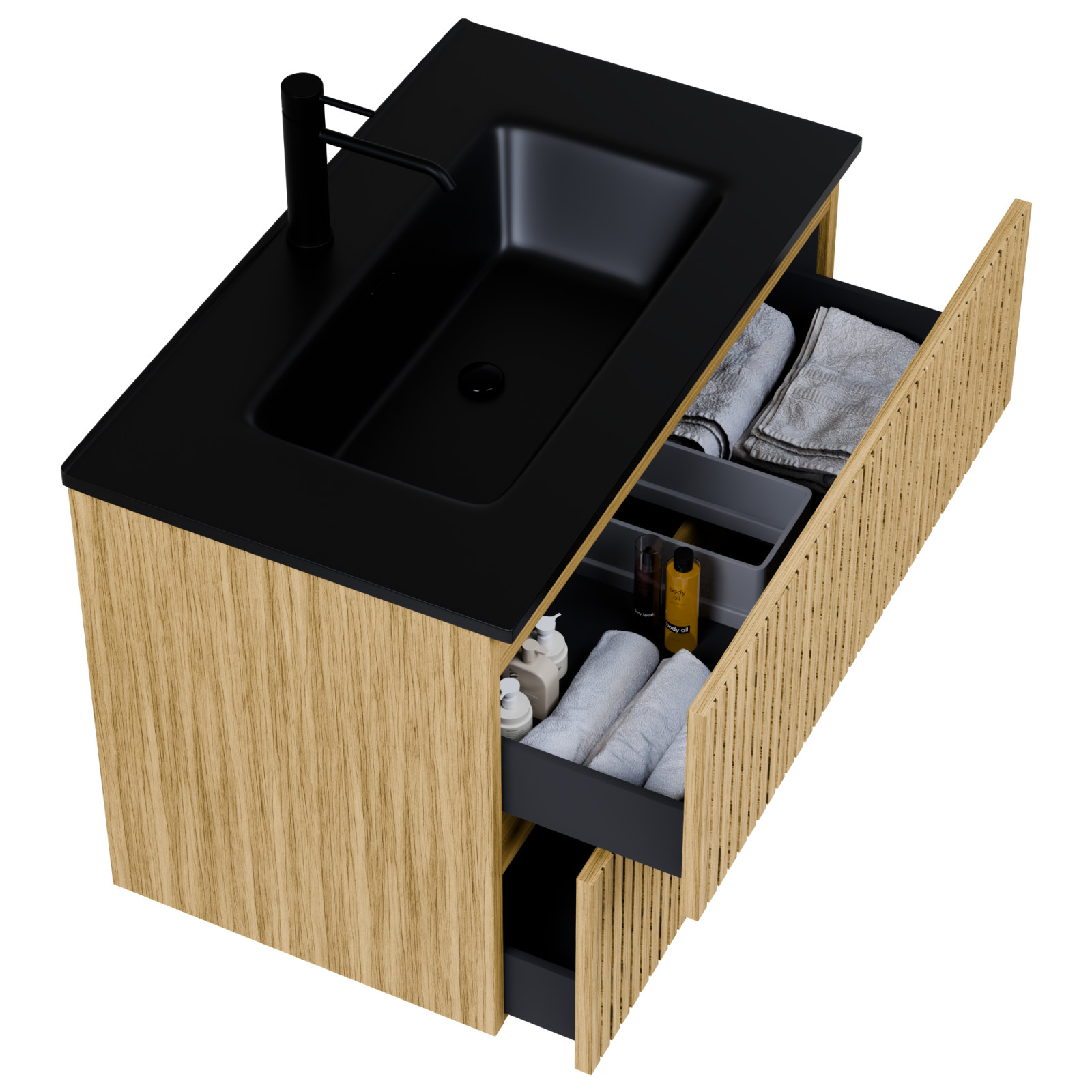 Saját márkás 60 cm széles fali mosdószekrény hikoridió színben, bordázott hikoridió színű fiók fronttal, fekete slim mosdóval, rejtett fióksínnel és önbehúzos technológiával ellátott. A fiókok modern push-to-open mechanizmussal nyílnak, amely mechanikus rugós rendszerrel biztosítja a fogantyú nélküli nyitást.