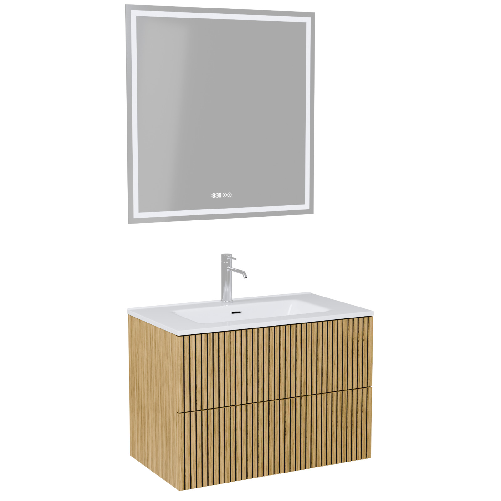 Saját márkás 60 cm széles komplett fürdőszoba bútor fali mosdószekrénnyel hikoridió színben, bordázott hikoridió színű fiók fronttal, fényes fehér slim mosdóval és fali okos LED tükörrel. A fiókok modern push-to-open mechanizmussal nyílnak, amely mechanikus rugós rendszerrel biztosítja a fogantyú nélküli nyitást.