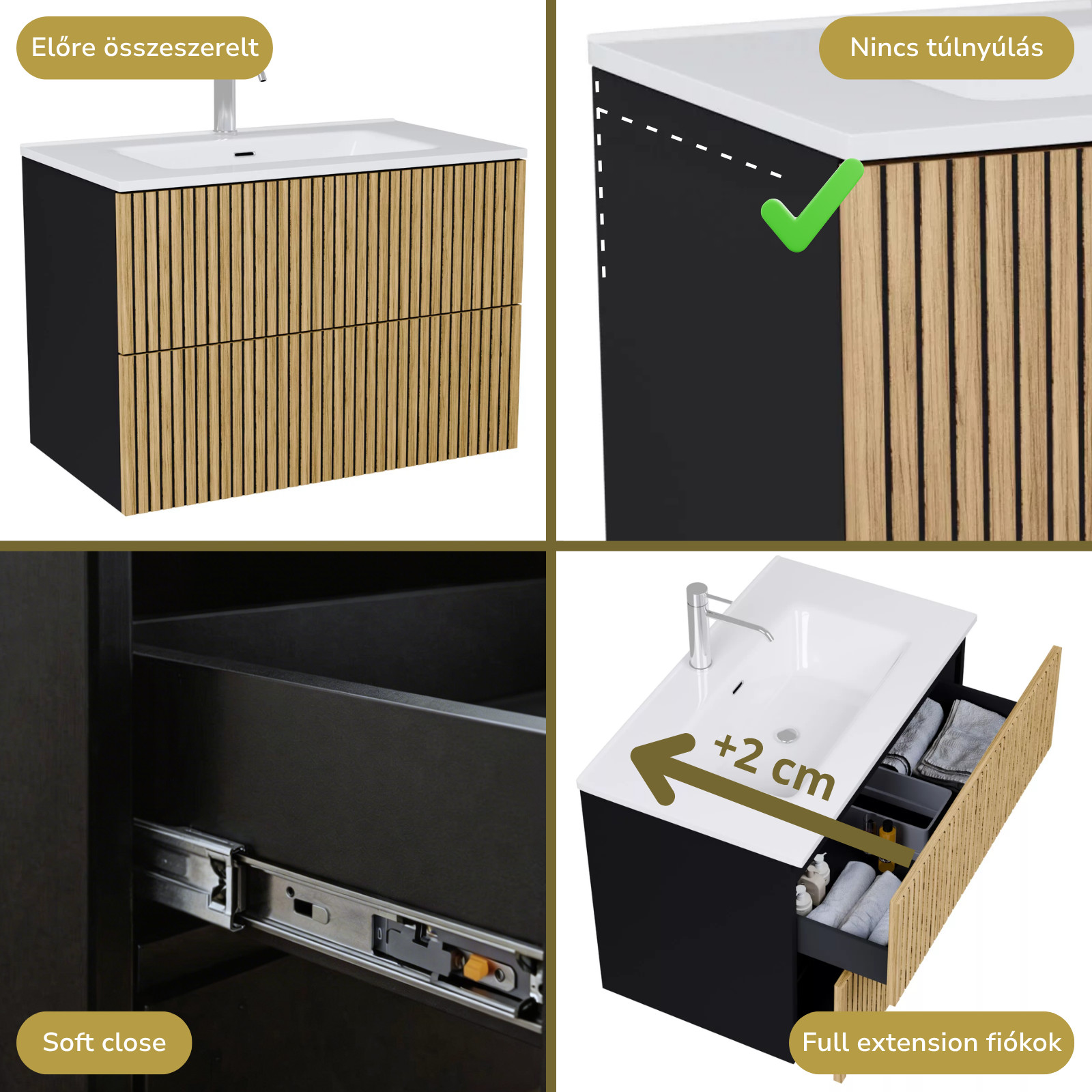 matt fekete mosdószekrény, teljes kihúzhatóságú fiókokkal