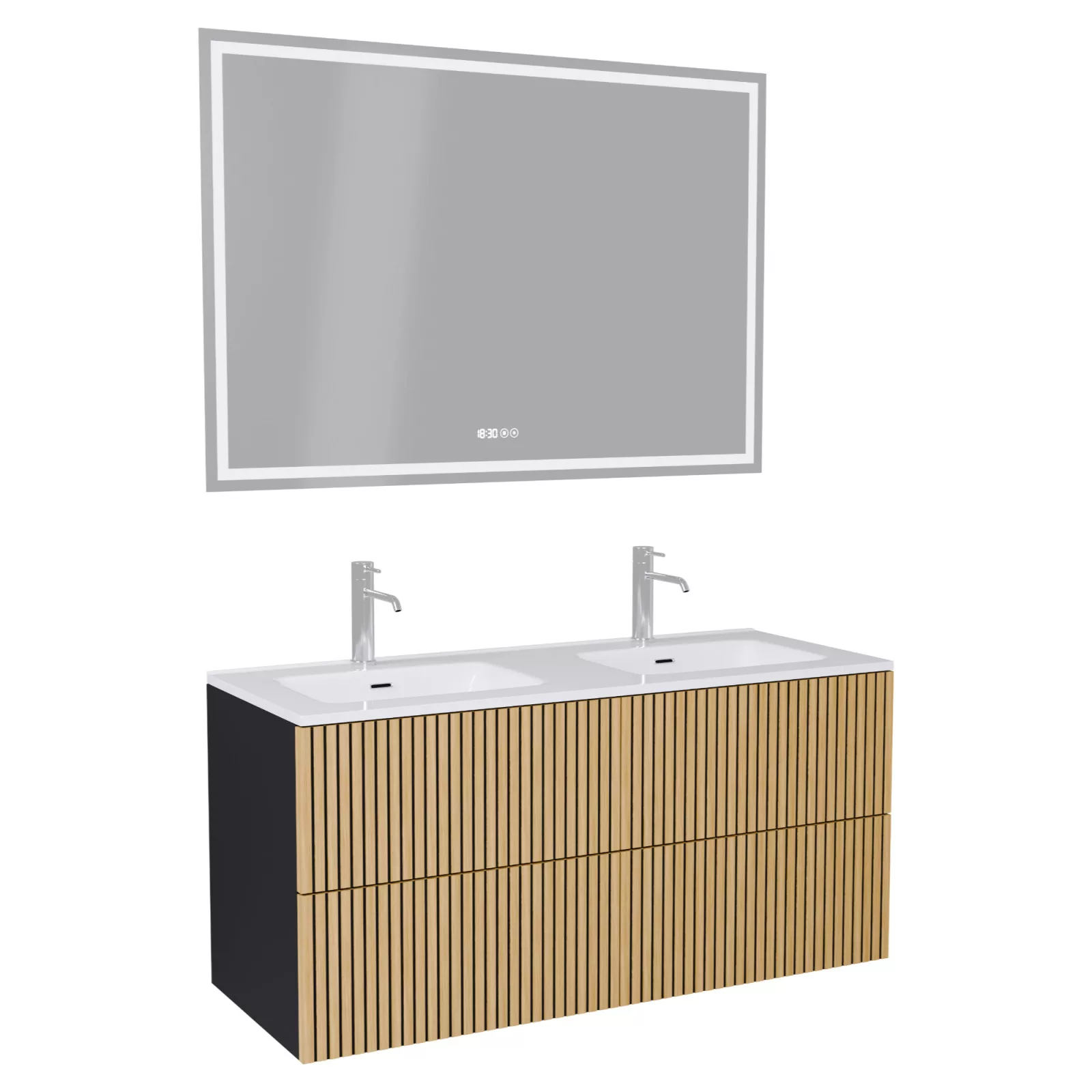 Saját márkás 120 cm széles komplett fürdőszoba bútor fali mosdószekrénnyel matt fekete színben, bordázott hikoridió színű fiók fronttal és fali okos LED tükörrel. A fiókok modern push-to-open mechanizmussal nyílnak, amely mechanikus rugós rendszerrel biztosítja a fogantyú nélküli nyitást.
