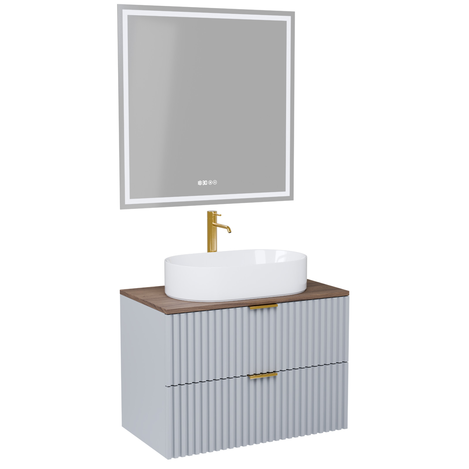 Saját márkás 60 cm széles komplett fürdőszoba bútor fali mosdószekrénnyel füst szürke színben, 3D-s színazonos fiók fronttal, szálcsiszolt arany fogantyúkkal, tölgyfa színű mosdópulttal és fali okos LED tükörrel.