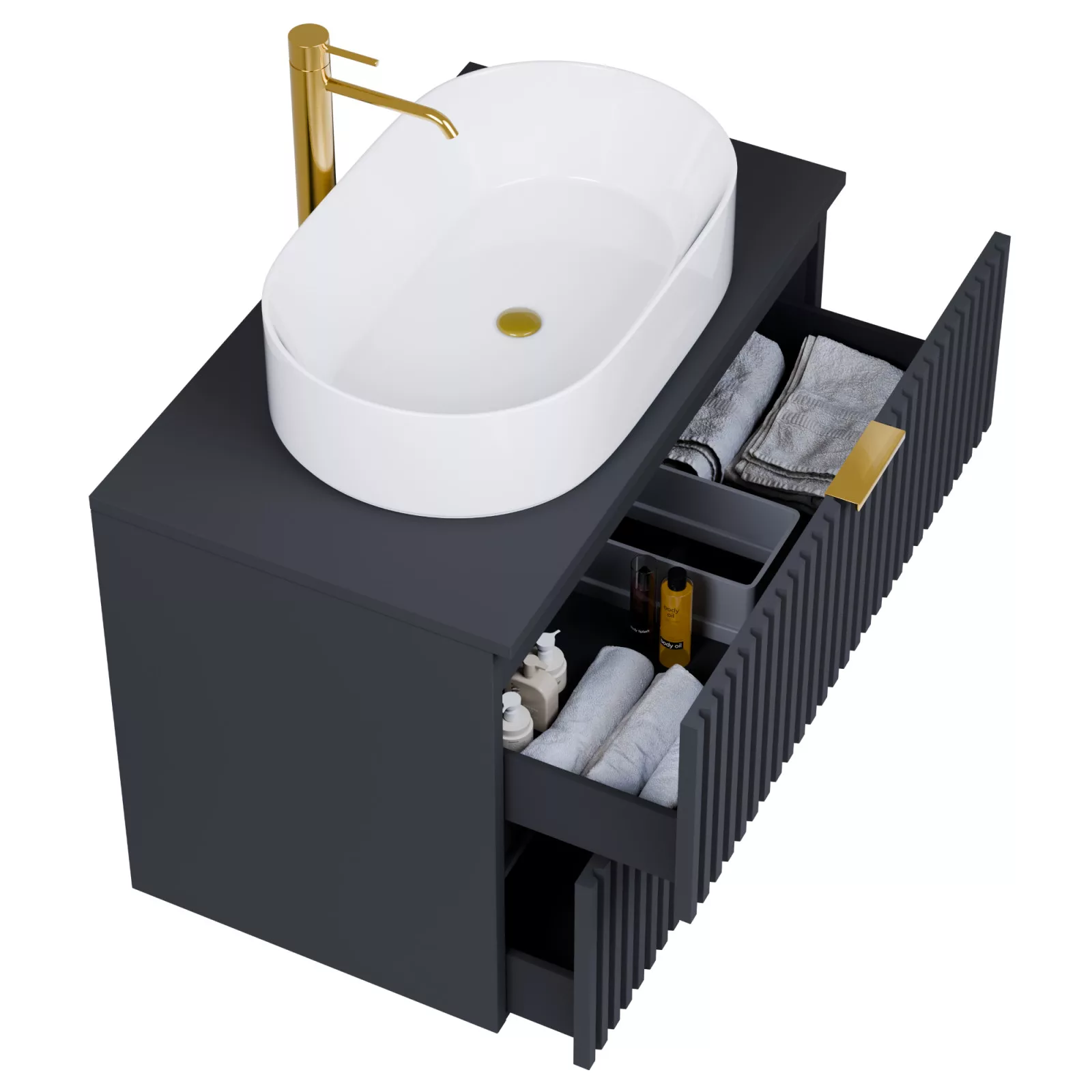 • matt antracit mosdószekrény, teljes kihúzhatóságú fiókokkal