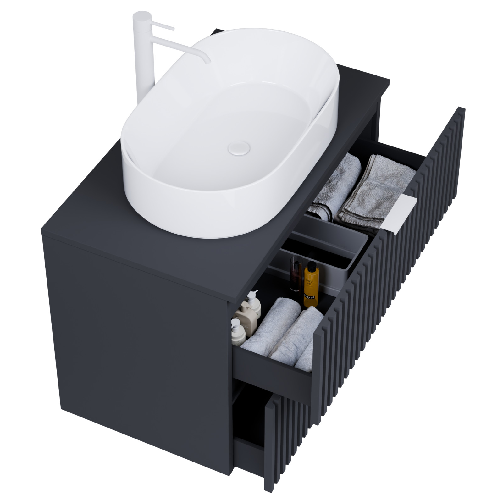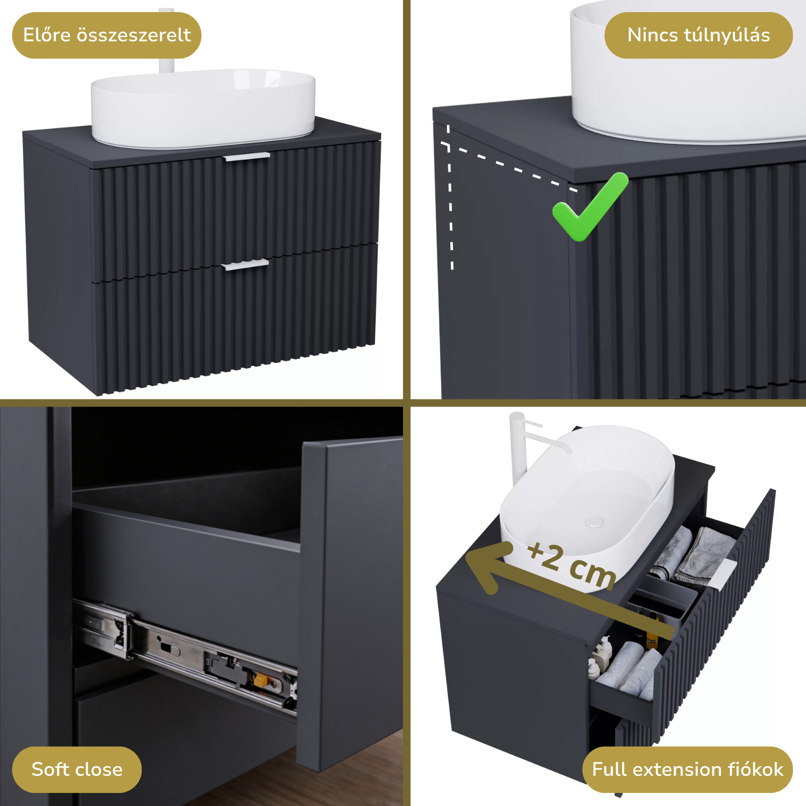 matt antracit mosdószekrény, teljes kihúzhatóságú fiókokkal