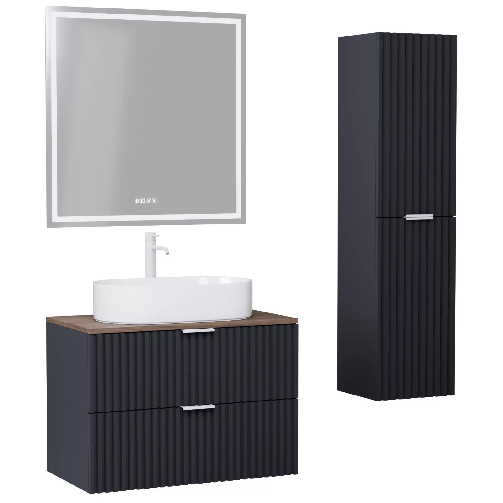 Napjainkban a praktikum mellett a fürdőszoba esztétikus megjelenése is fontos szempont. A függesztett bútorok egyre elterjedtebbé válnak, mivel számos előnnyel rendelkeznek, ide sorolható a modern, könnyed megjelenés és az egyszerű tisztítás . A függesztett fürdőszobai bútorok a klasszikus és modernebb stílusú fürdőszobákban is megállják a helyüket egyaránt. Nagyfokú rugalmasság jellemzi őket, mivel szinte bárhol elhelyezhetők a fürdőszobán belül. További előnyük, hogy soft close (csillapítós) zsanérral felszereltek, így becsukáskor az ajtó vagy fiók finoman záródik be, csökkentve a terhelést és növelve az élettartamot . A szekrény fehér és matt fekete mosdóval, illetve mosdópulttal is szabadon kombinálható ízlés szerint. A teljesség érdekében a mosdószekrényekhez illő LED okostükröt és magasszekrényt is választhatunk, hogy a fürdőszobában lévő bútorok egy szemet gyönyörködtető egységet alkossanak.