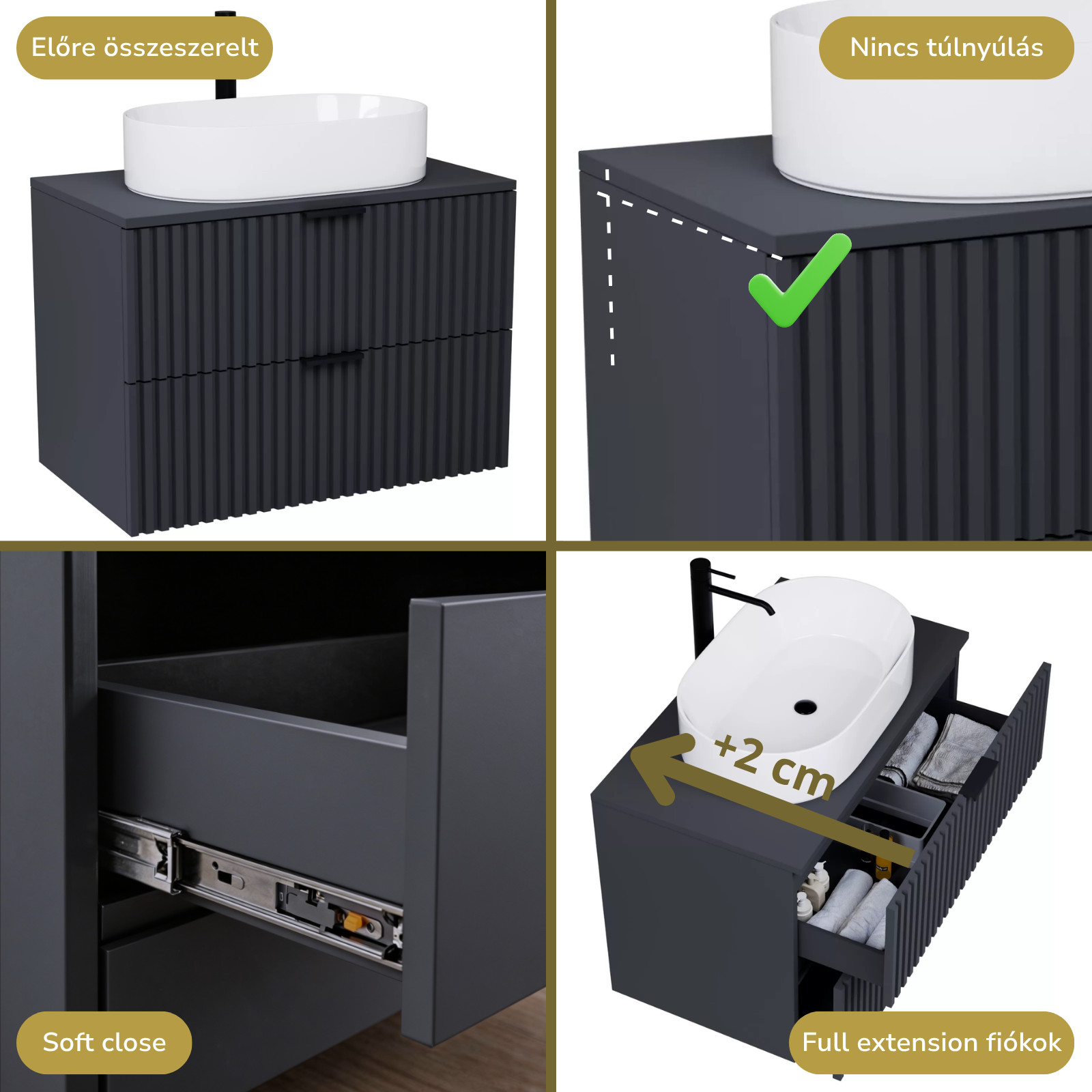 matt antracit mosdószekrény, teljes kihúzhatóságú fiókokkal