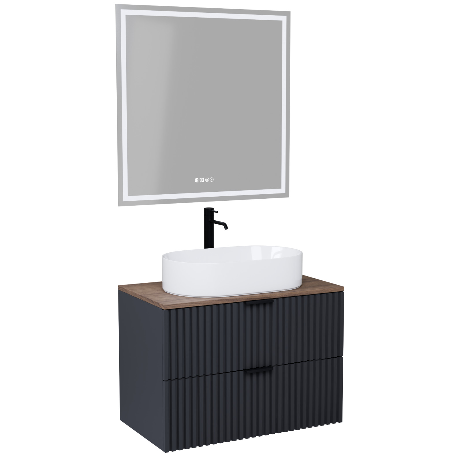 HD Rapallo Matt Antracit 80 komplett fürdőszoba bútor fali mosdószekrénnyel, matt fekete fogantyúkkal, tölgyfa színű mosdópulttal és tükörrel
