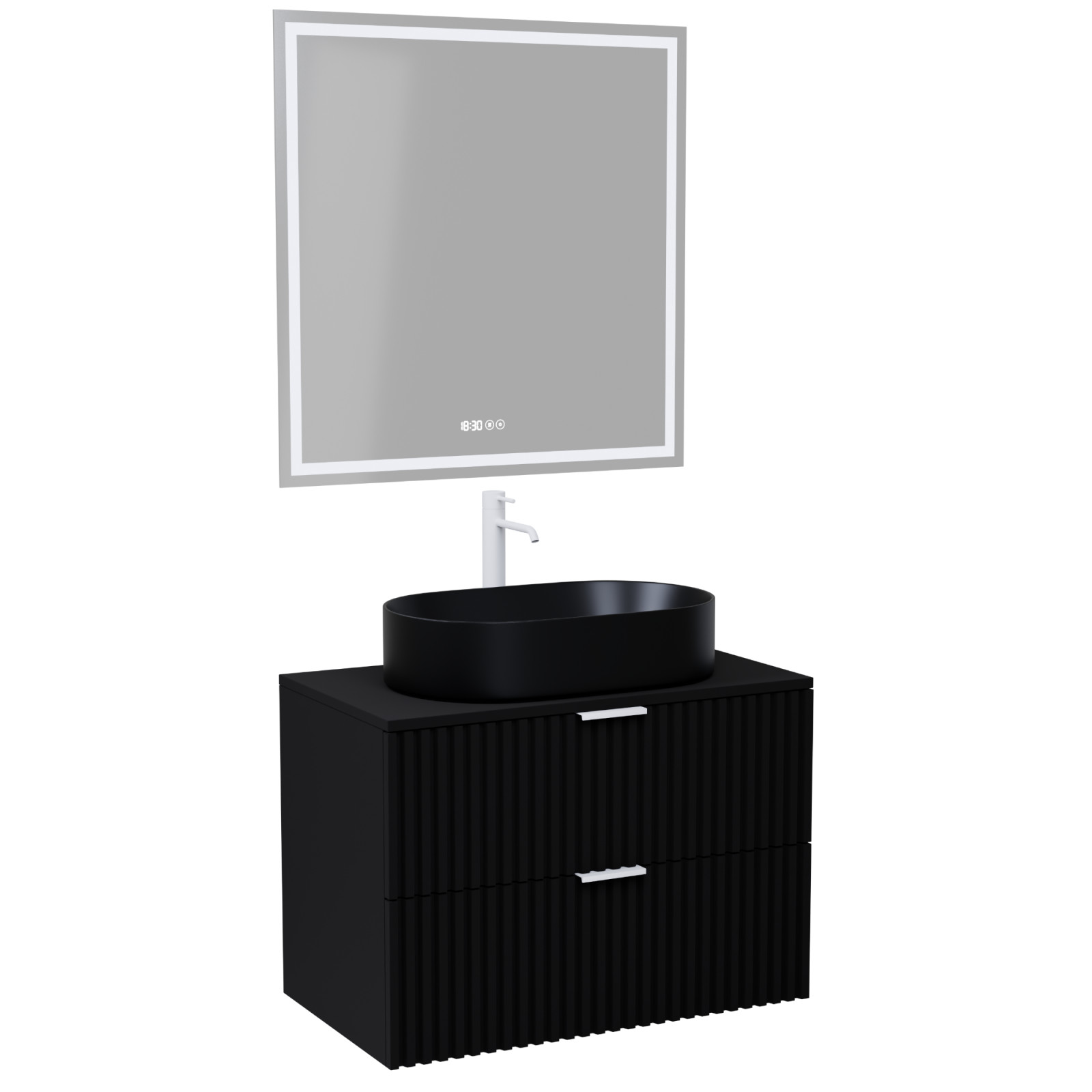Saját márkás 60 cm széles komplett fürdőszoba bútor fali mosdószekrénnyel matt fekete színben, 3D-s színazonos fiók fronttal, matt fehér fogantyúkkal, matt fekete színű mosdópulttal és fali okos LED tükörrel.