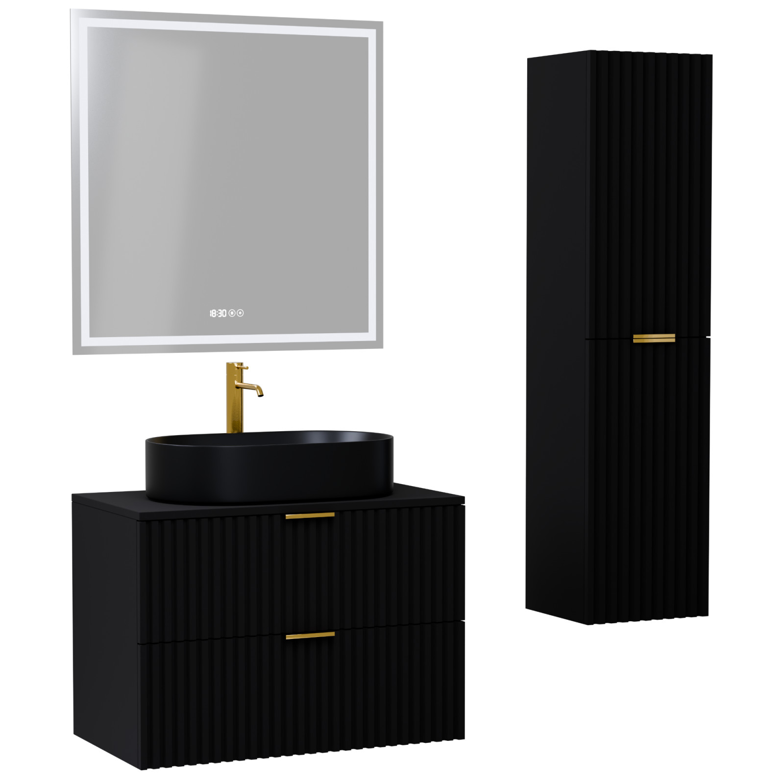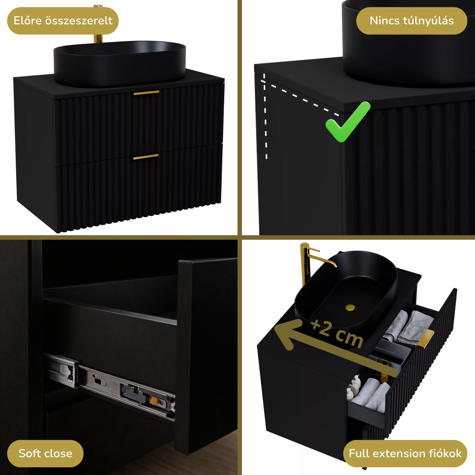 Rapallo Matt Black 80 komplett fürdőszoba bútor szett, szálcsiszolt arany fogantyúkkal