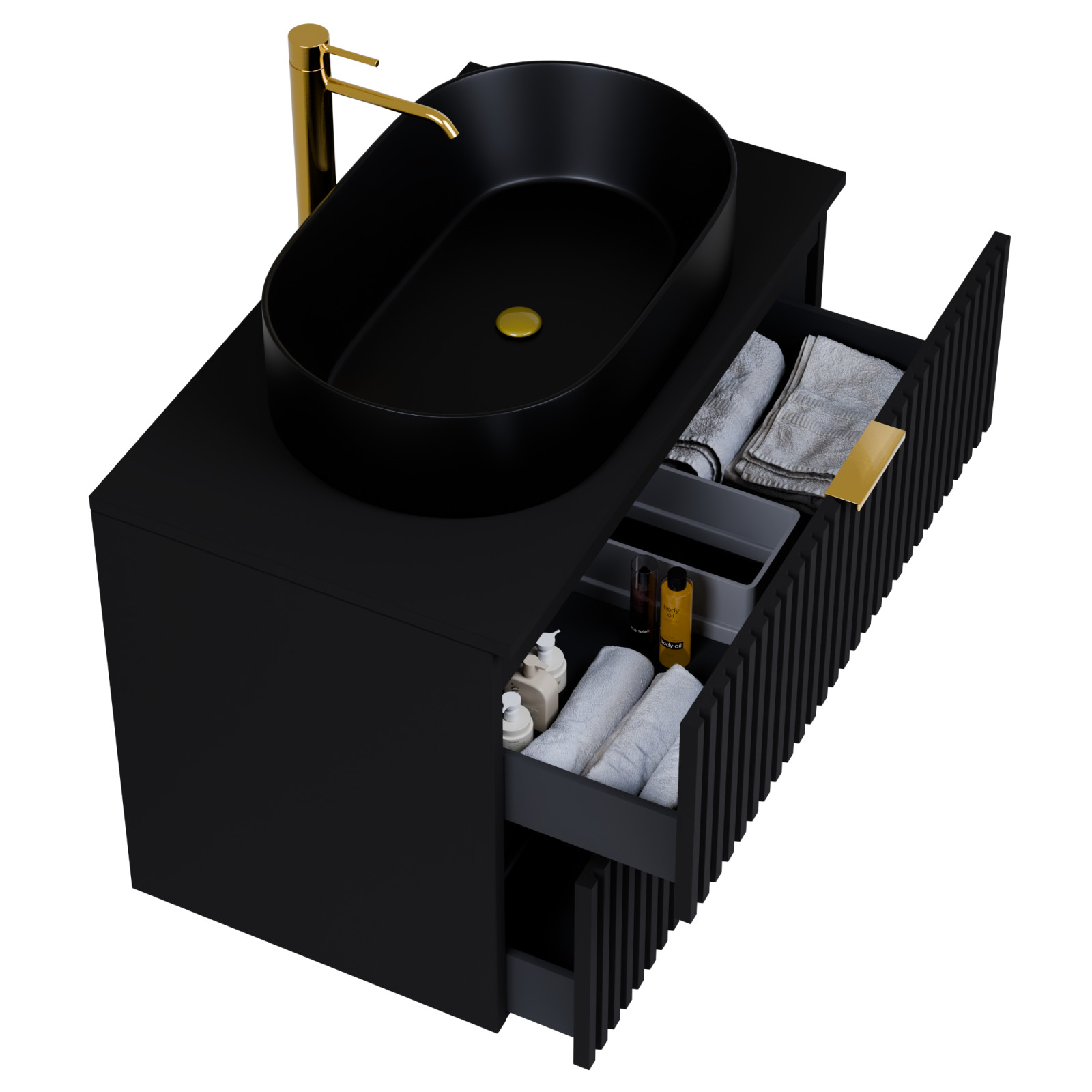 matt fekete mosdószekrény, teljes kihúzhatóságú fiókokkal