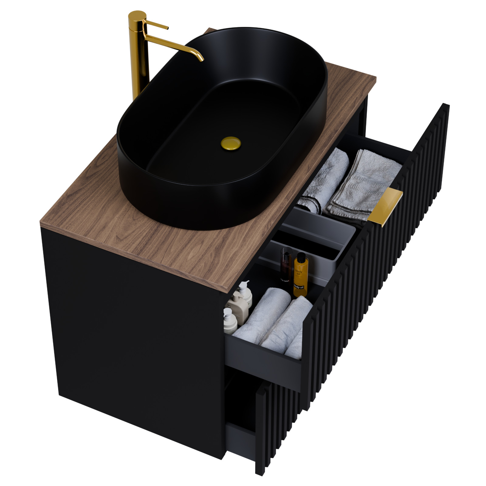 matt fekete mosdószekrény, teljes kihúzhatóságú fiókokkal
