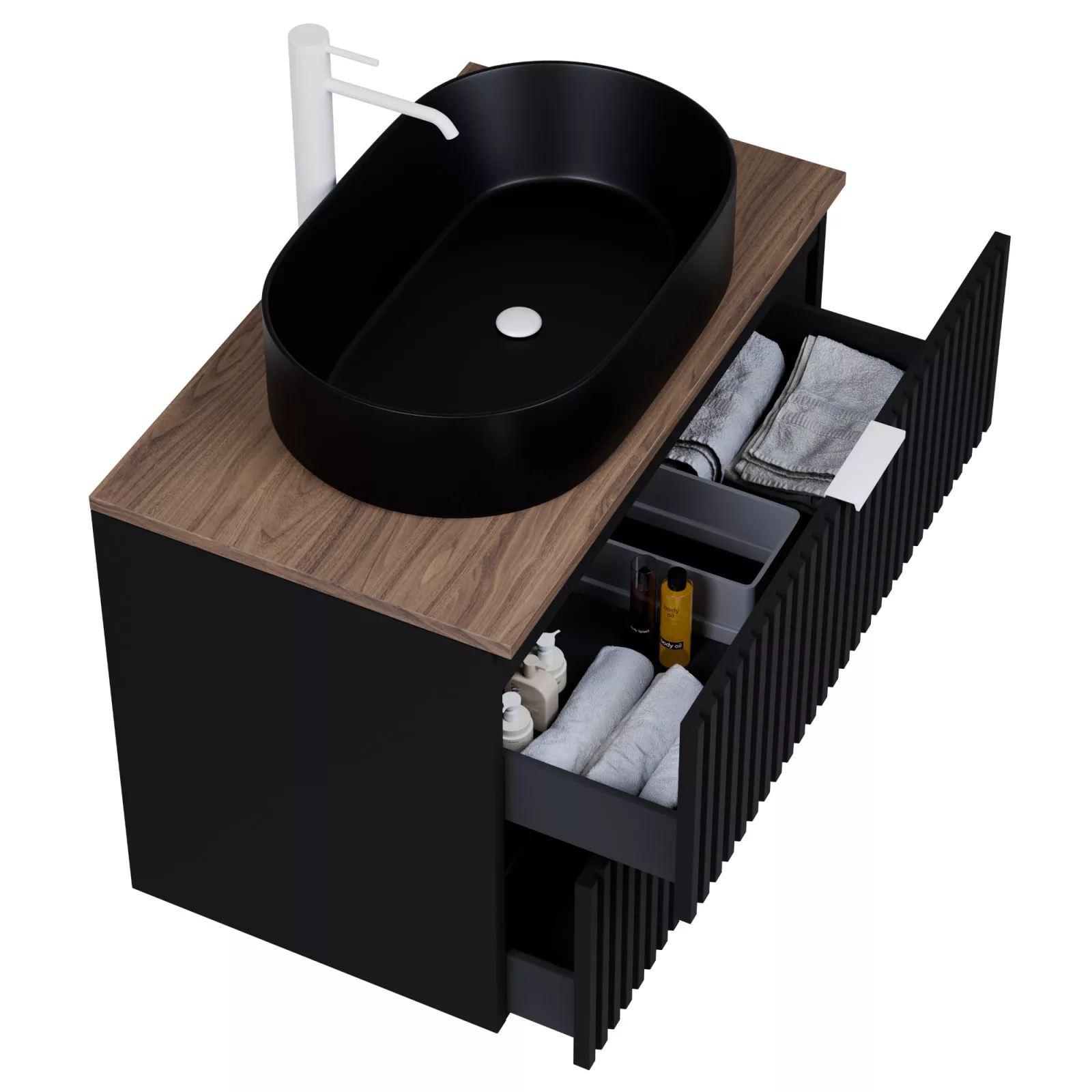 matt fekete mosdószekrény, teljes kihúzhatóságú fiókokkal