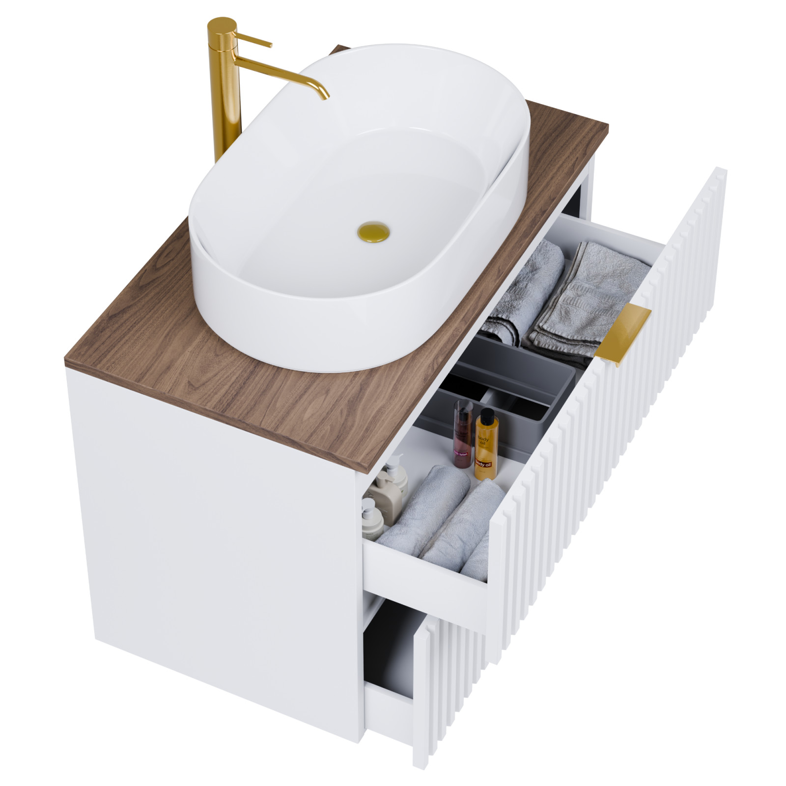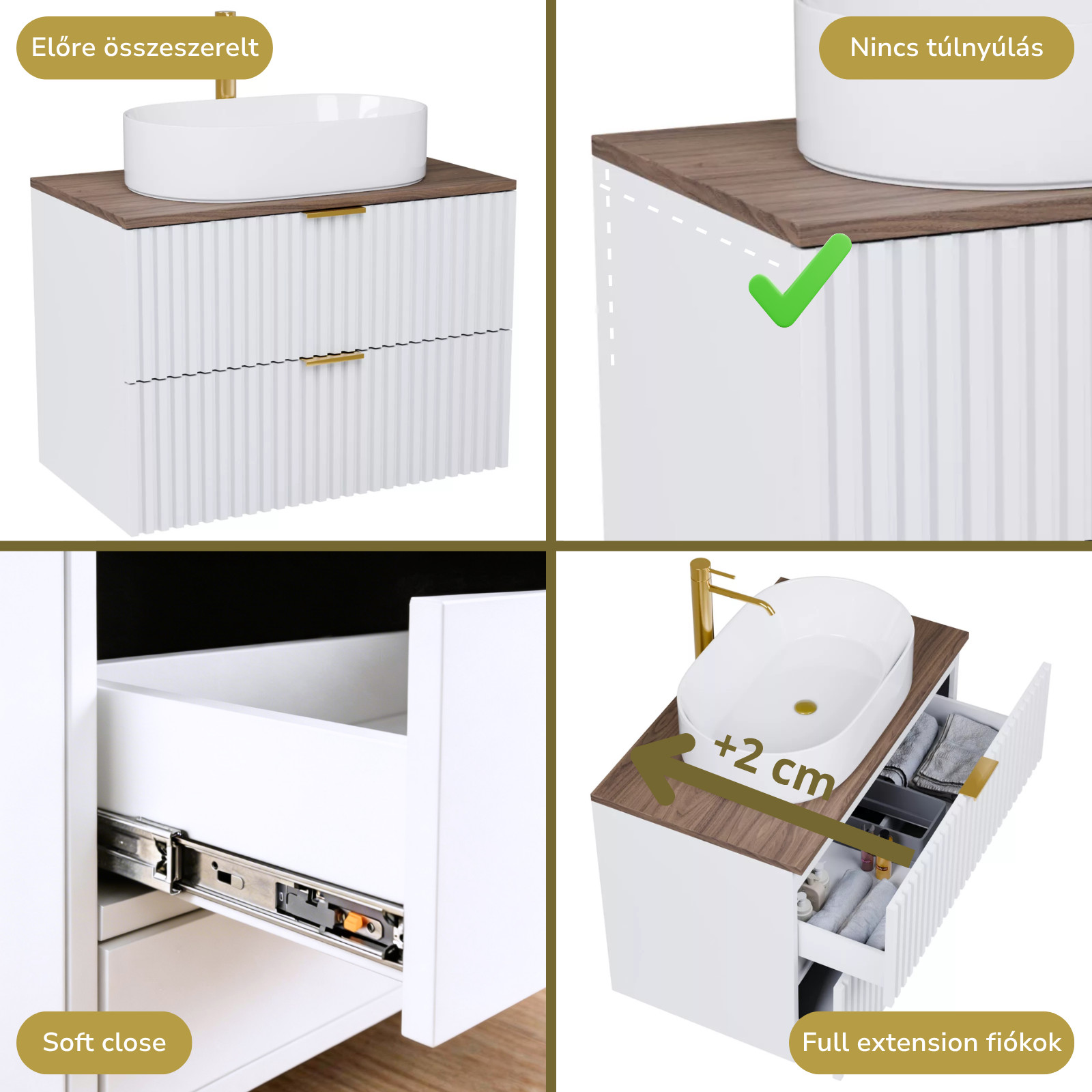 Saját márkás 60 cm széles fali mosdószekrény matt fehér színben, 3D-s színazonos fiók fronttal, szálcsiszolt arany fogantyúkkal, tölgyfa színű mosdópulttal, rejtett fióksínnel és önbehúzos technológiával ellátott.