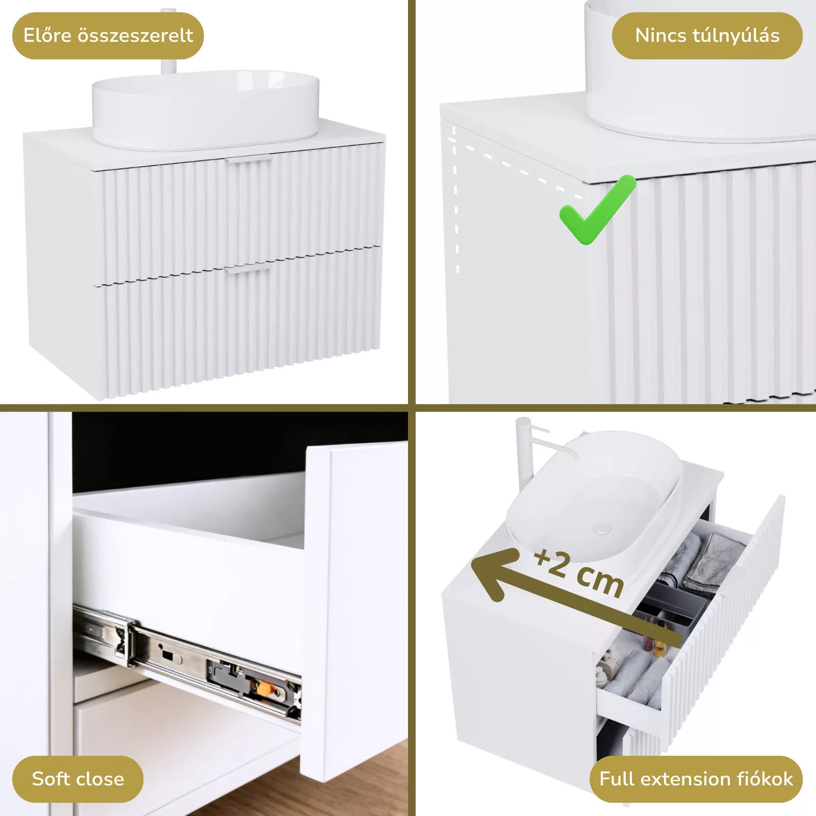 A bútort összeszerelve szállítjuk ki, így Önnek csak a mosdót és a fiók frontot kell ráhelyeznie!