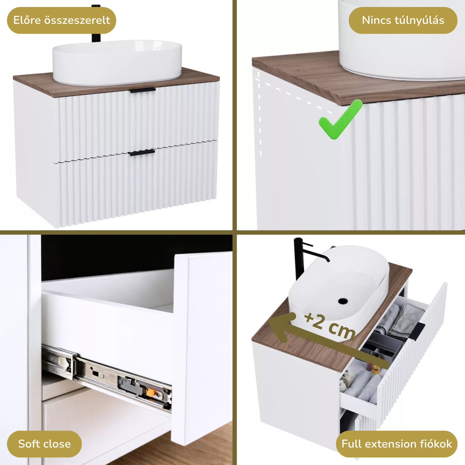 A bútort összeszerelve szállítjuk ki, így Önnek csak a mosdót és a fiók frontot kell ráhelyeznie!