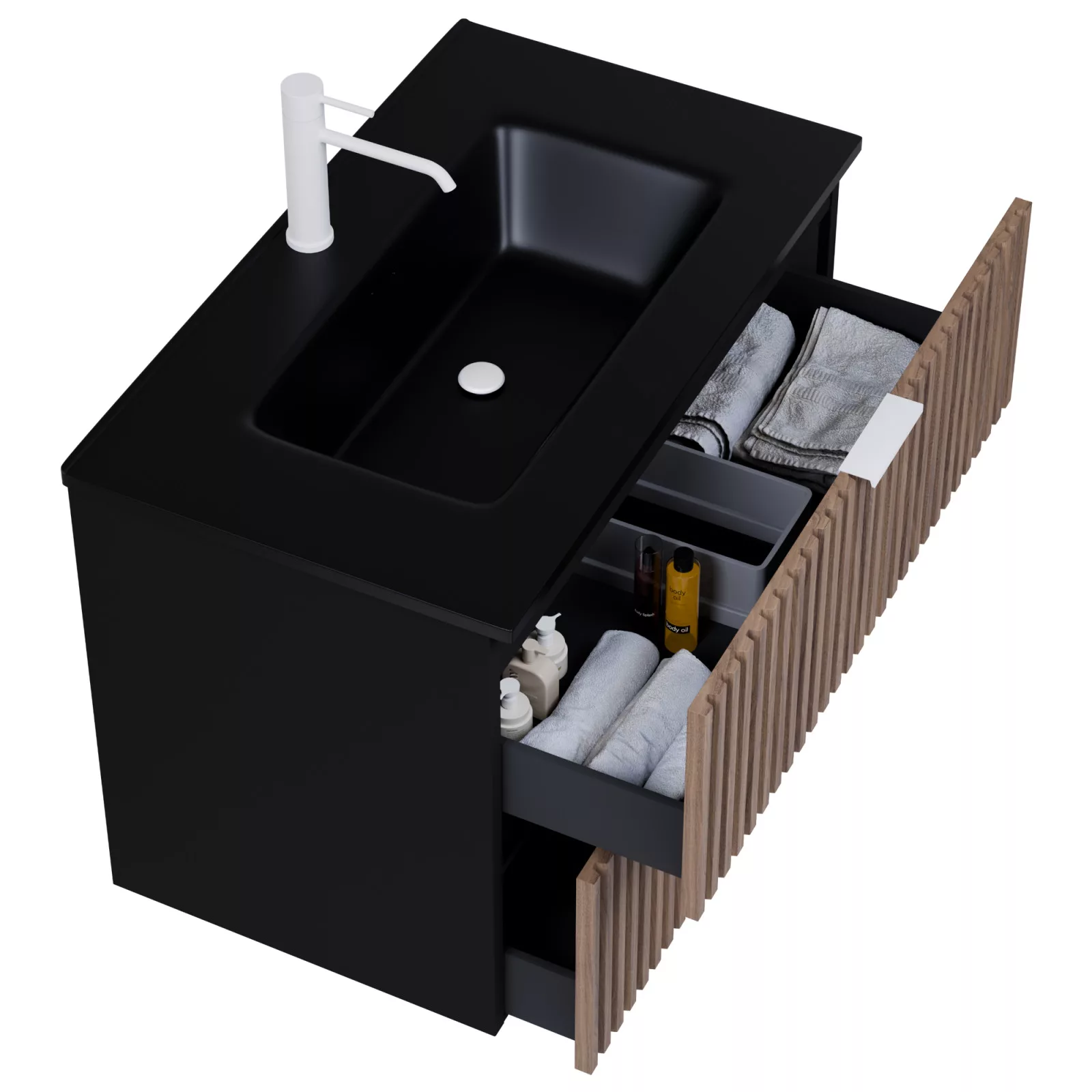 • matt fekete mosdószekrény, teljes kihúzhatóságú fiókokkal