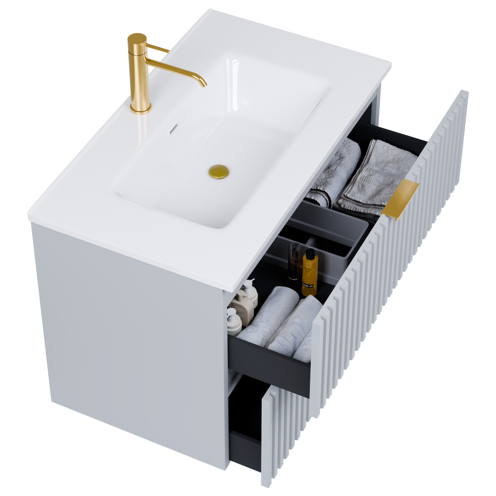 HD Ravello Fume Grey 80 fali mosdószekrény szálcsiszolt arany fogantyúkkal és fényes fehér slim mosdóval