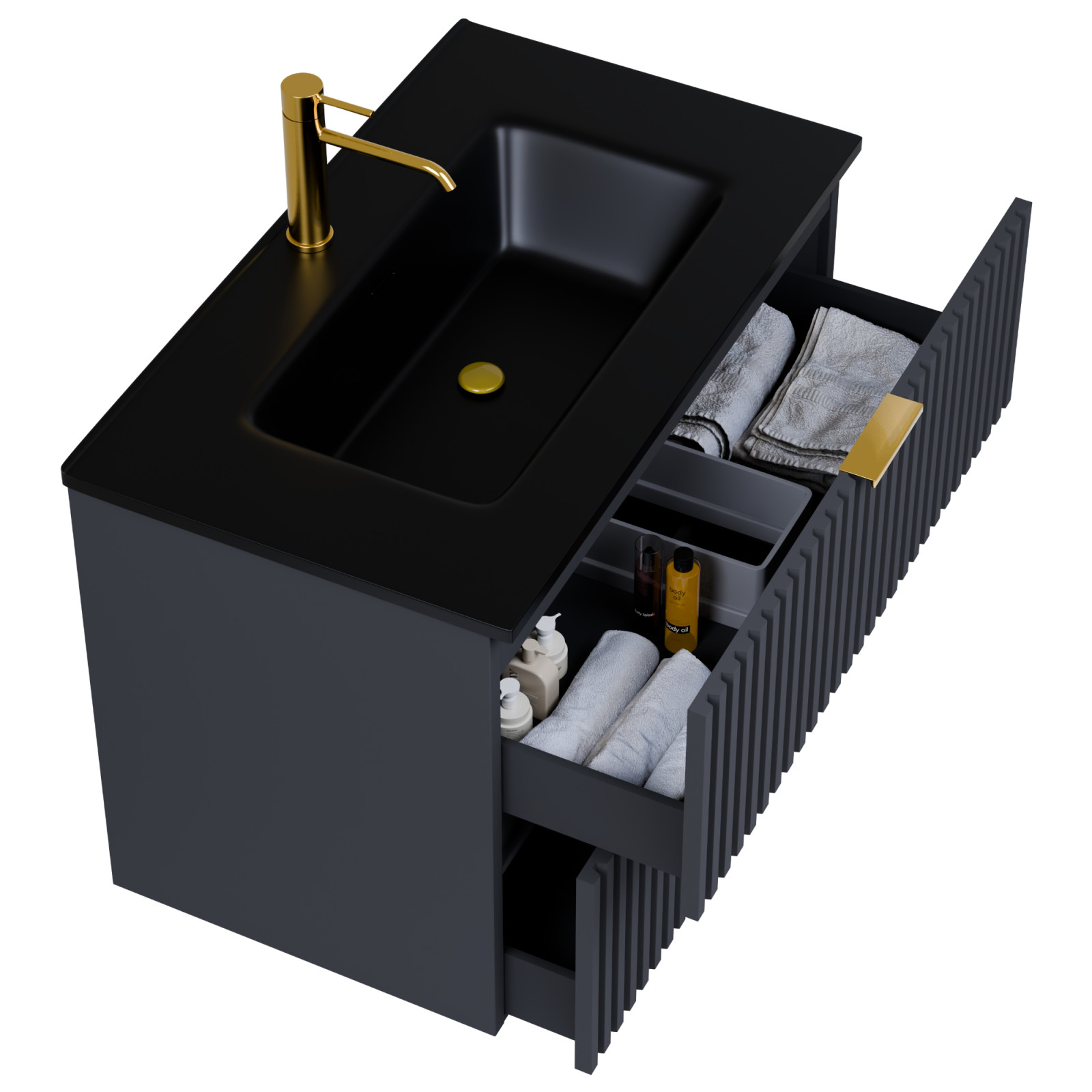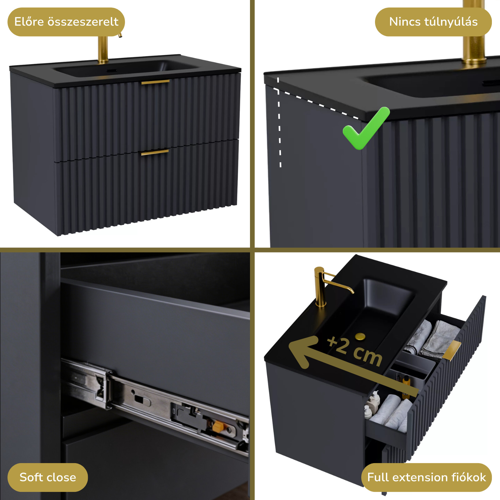 Saját márkás 60 cm széles fali mosdószekrény matt antracit színben, 3D-s színazonos fiók fronttal, szálcsiszolt arany fogantyúkkal, fekete slim mosdóval, rejtett fióksínnel és önbehúzos technológiával ellátott.