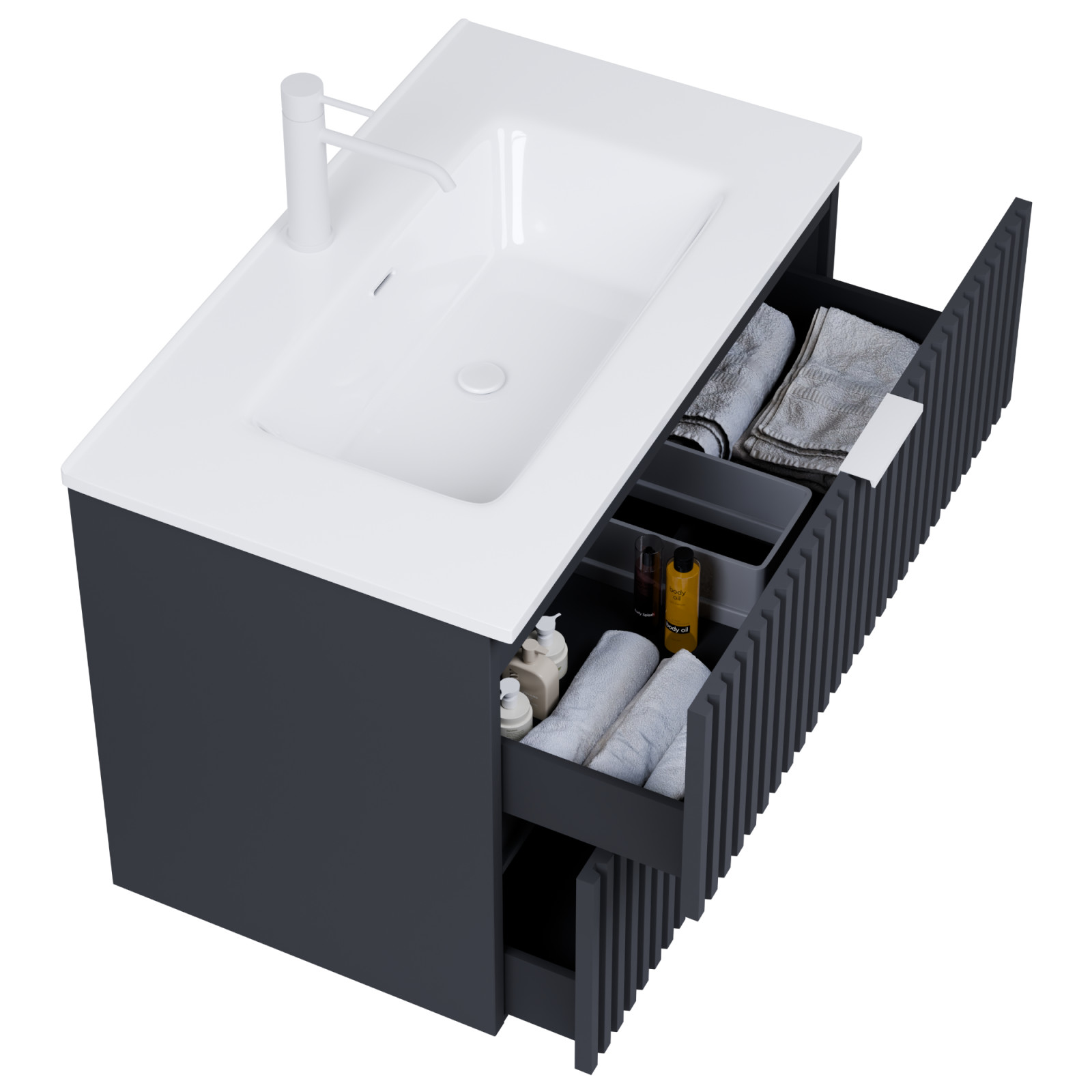 Saját márkás 60 cm széles fali mosdószekrény matt antracit színben, 3D-s színazonos fiók fronttal, matt fehér fogantyúkkal, fényes fehér slim mosdóval, rejtett fióksínnel és önbehúzos technológiával ellátott.