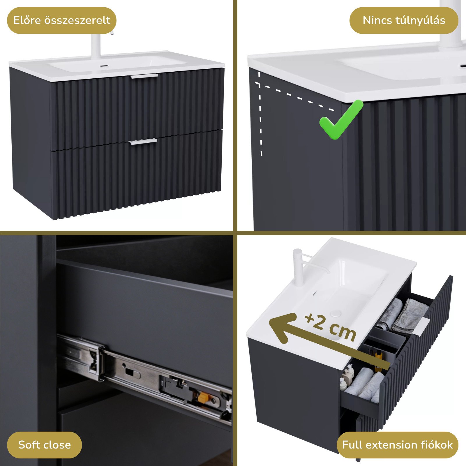 • matt antracit mosdószekrény, teljes kihúzhatóságú fiókokkal