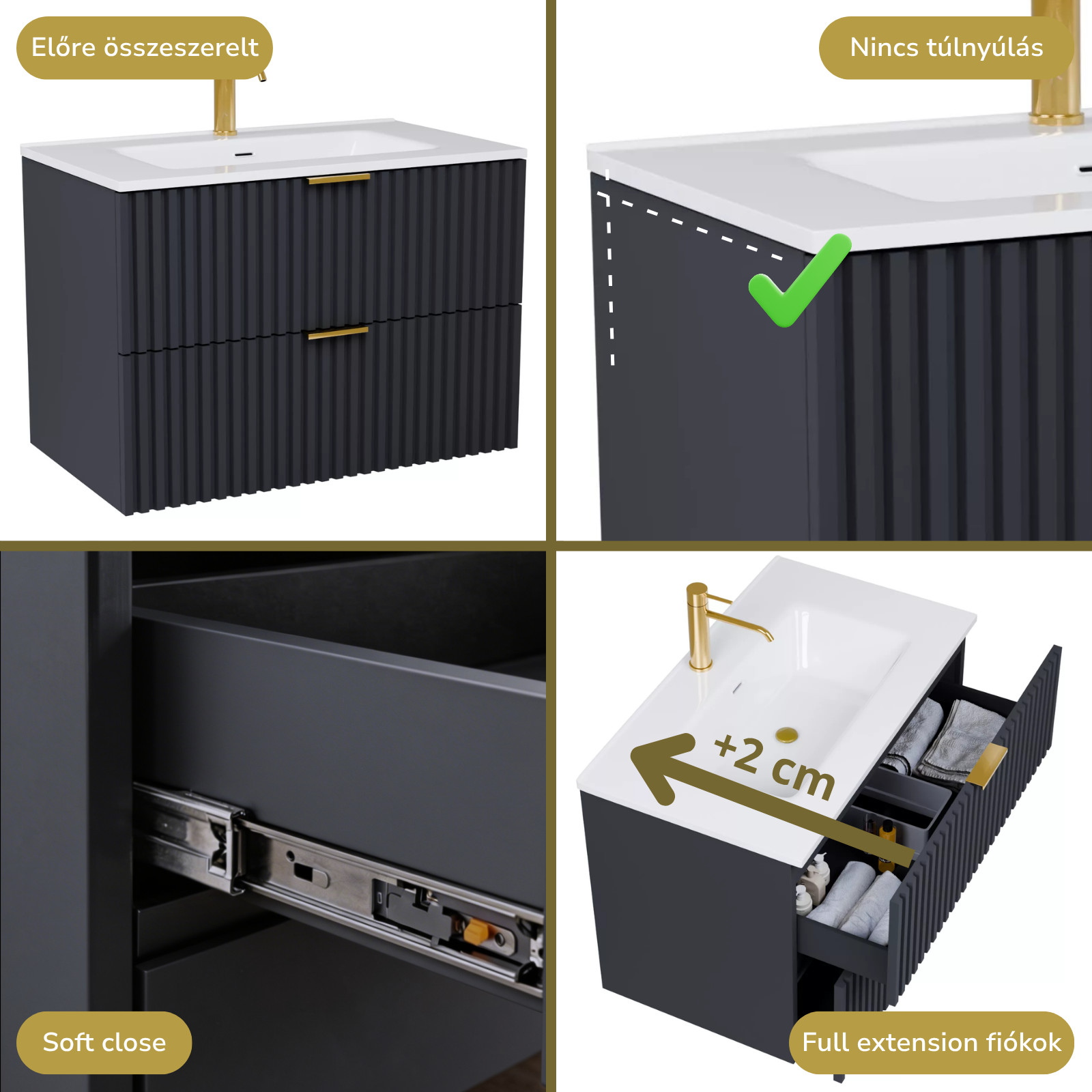 Ravello Matt Antracit 60 komplett fürdőszoba bútor szett, szálcsiszolt arany fogantyúkkal