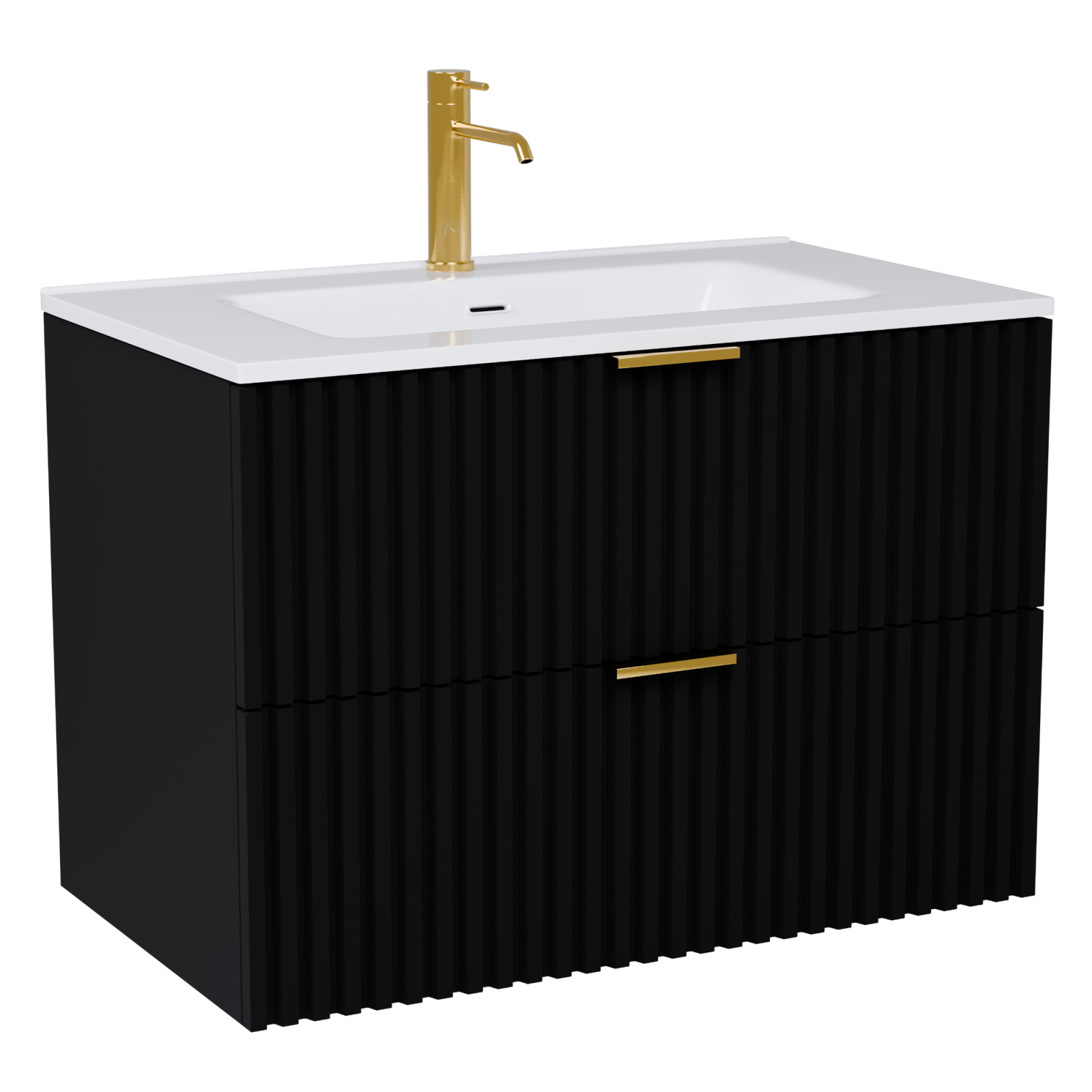 HD Ravello Matt Black 60 fali mosdószekrény szálcsiszolt arany fogantyúkkal és fényes fehér slim mosdóval