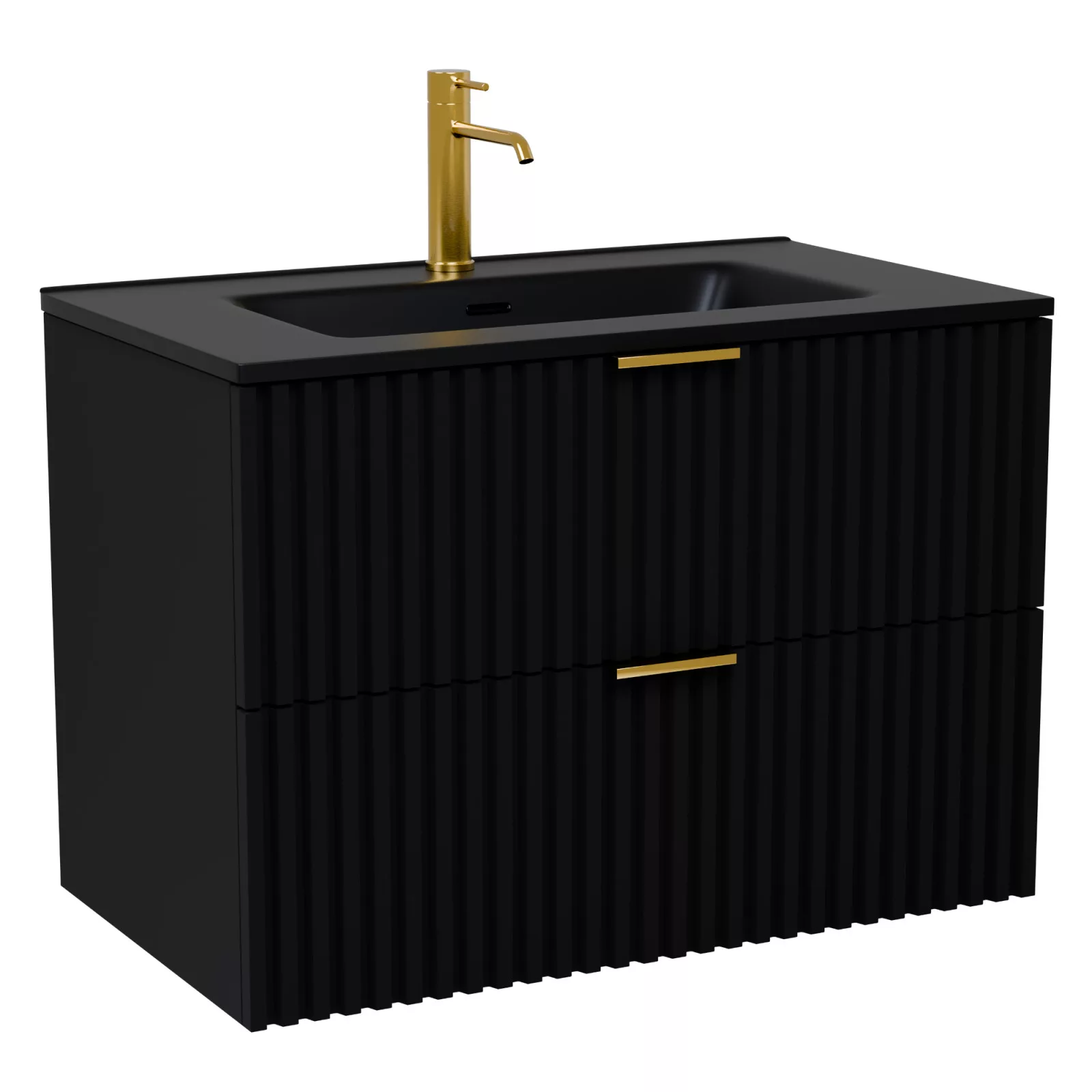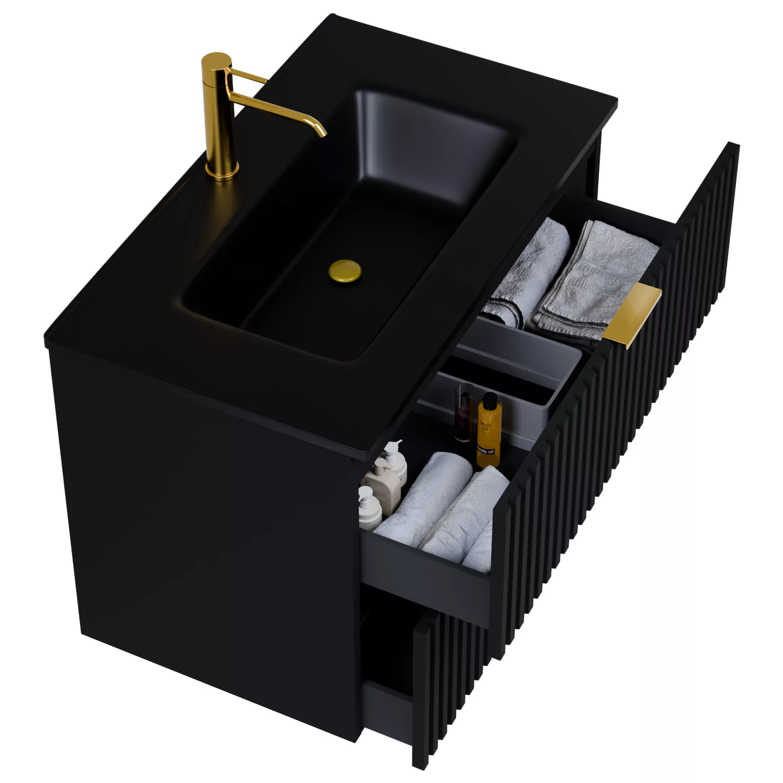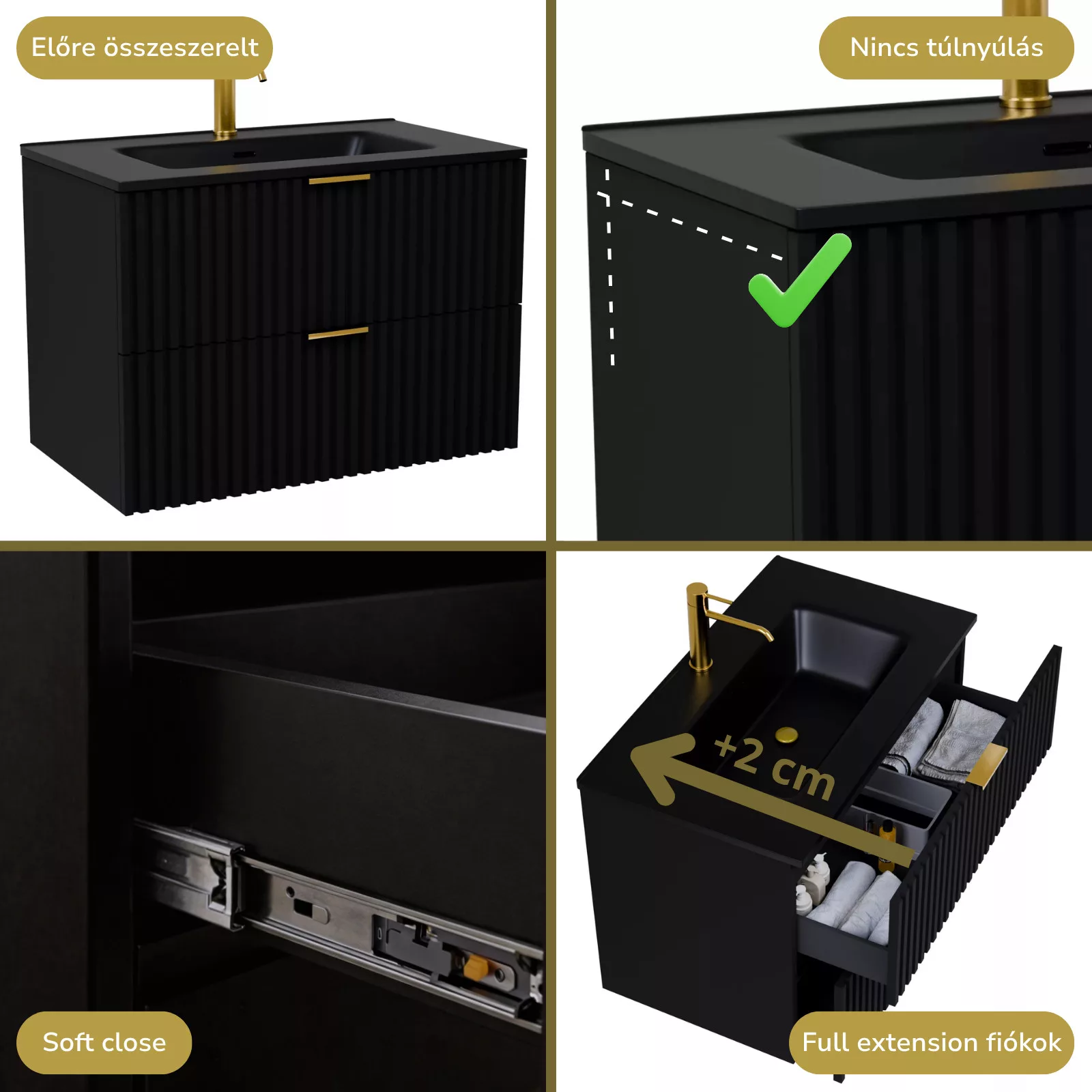 Saját márkás 60 cm széles fali mosdószekrény matt fekete színben, 3D-s színazonos fiók fronttal, szálcsiszolt arany fogantyúkkal, fekete slim mosdóval, rejtett fióksínnel és önbehúzos technológiával ellátott.