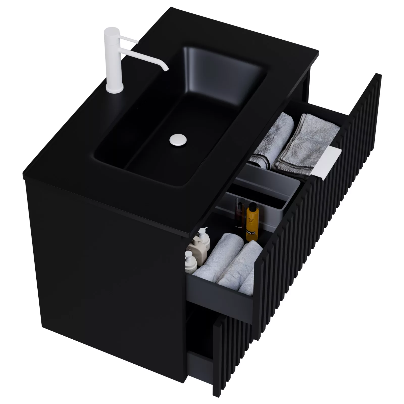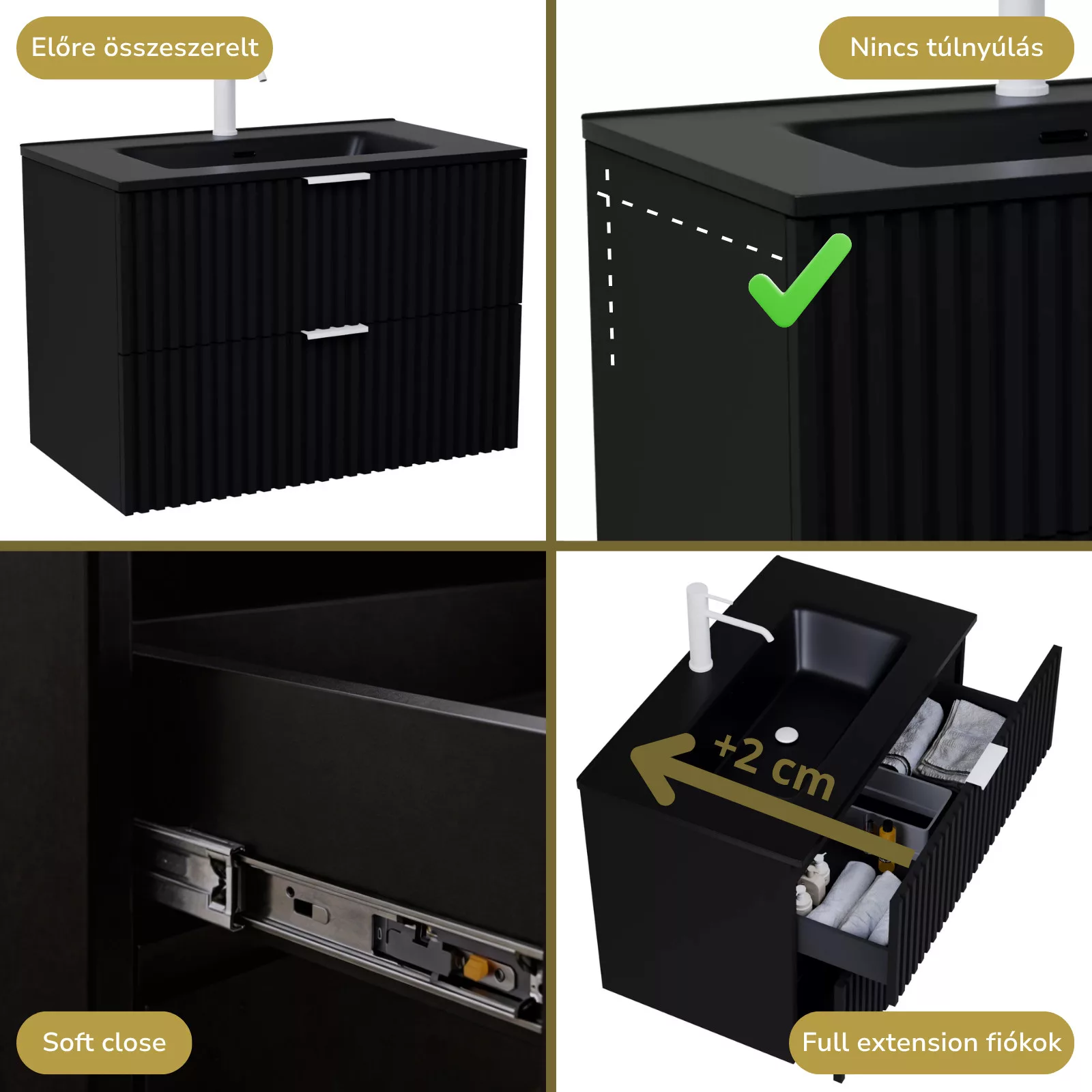 • matt fekete mosdószekrény, teljes kihúzhatóságú fiókokkal