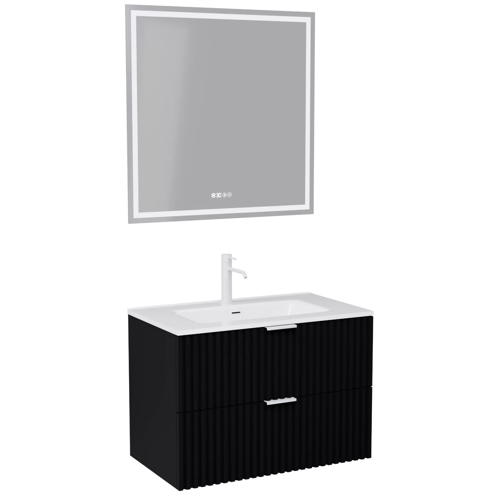 HD Ravello Matt Black 60 komplett fürdőszoba bútor fali mosdószekrénnyel, matt fehér fogantyúkkal és tükörrel