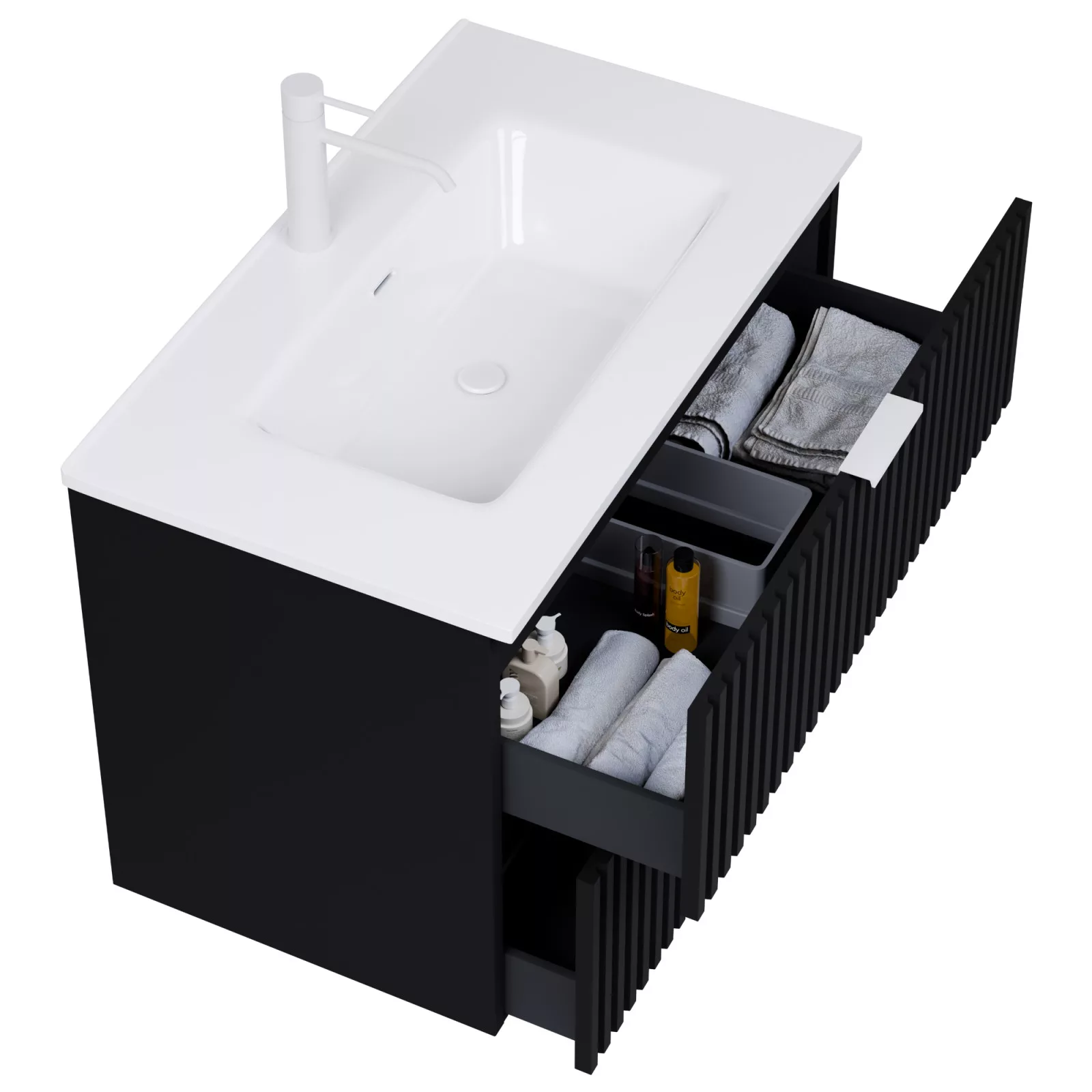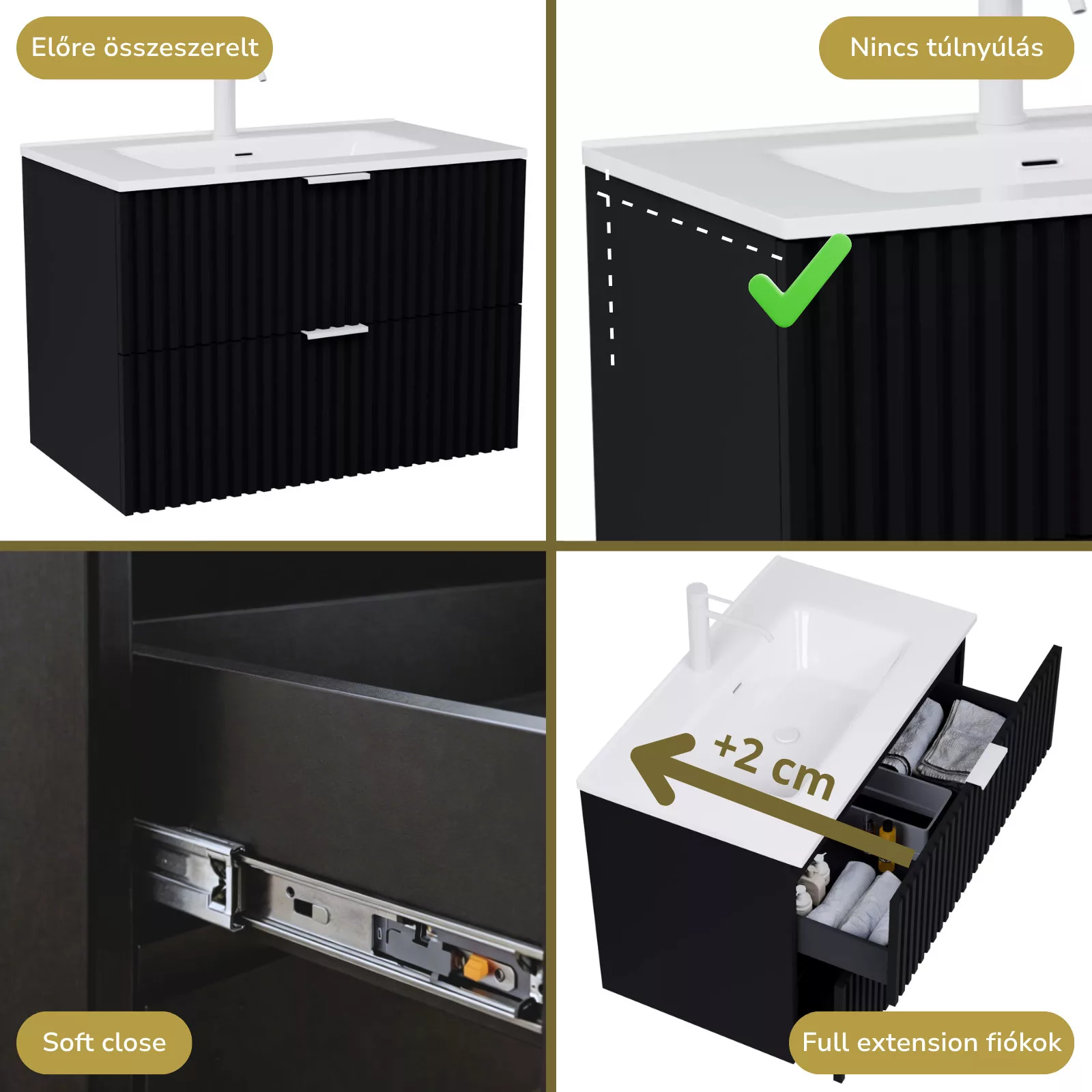 • matt fekete mosdószekrény, teljes kihúzhatóságú fiókokkal