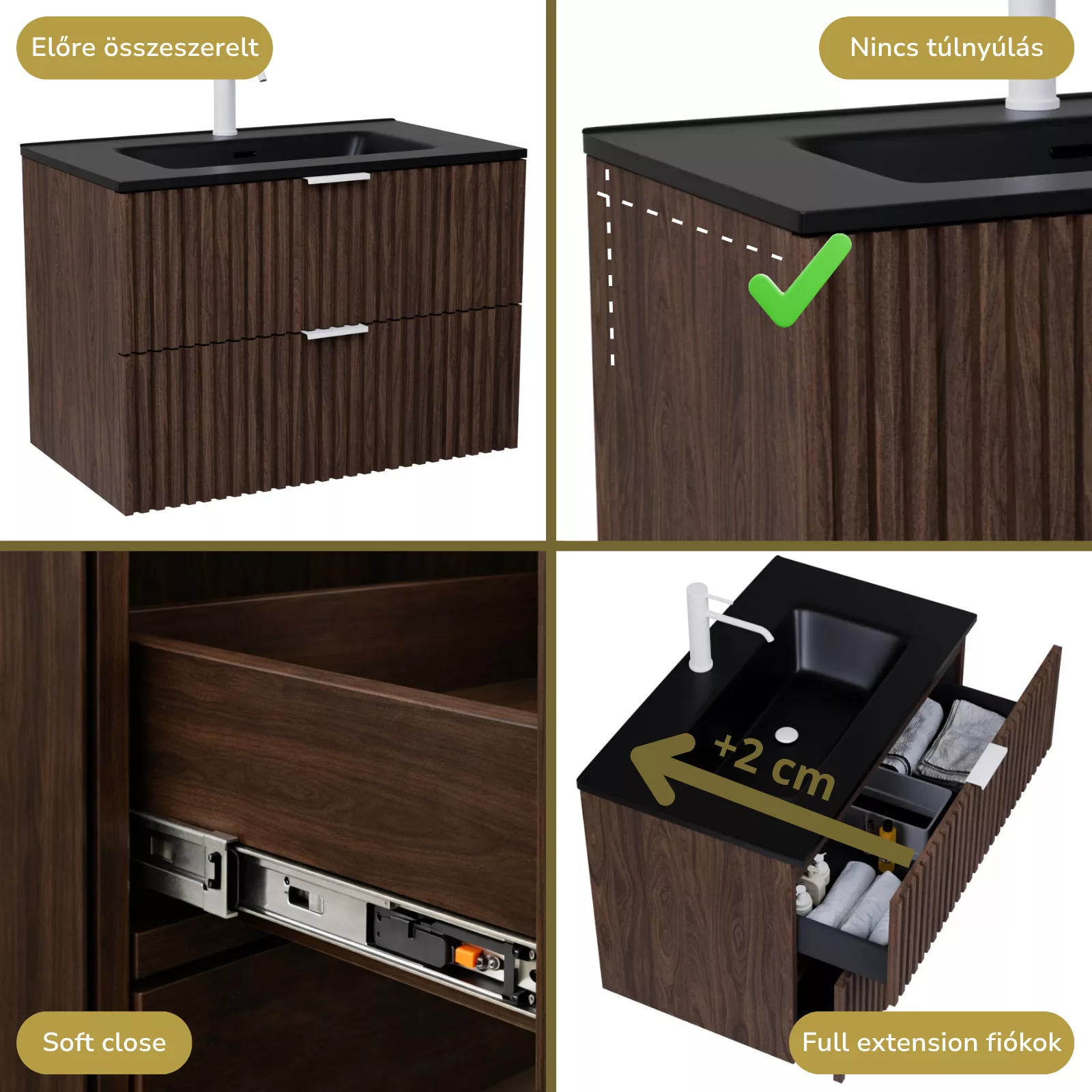 Saját márkás 60 cm széles fali mosdószekrény mogyoró színben, 3D-s színazonos fiók fronttal, matt fehér fogantyúkkal, fekete slim mosdóval, rejtett fióksínnel és önbehúzos technológiával ellátott.