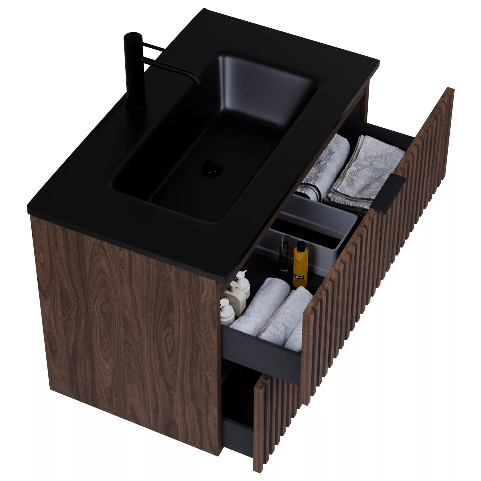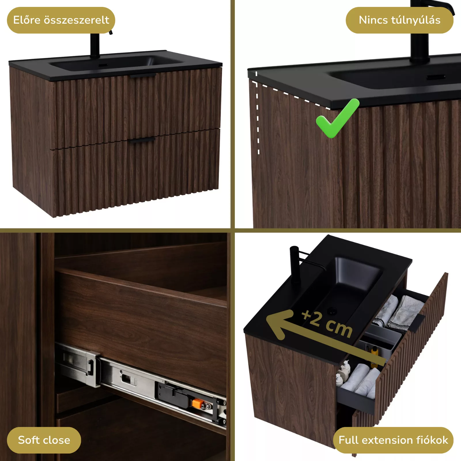 Saját márkás 60 cm széles fali mosdószekrény mogyoró színben, 3D-s színazonos fiók fronttal, matt fekete fogantyúkkal, fekete slim mosdóval, rejtett fióksínnel és önbehúzos technológiával ellátott.