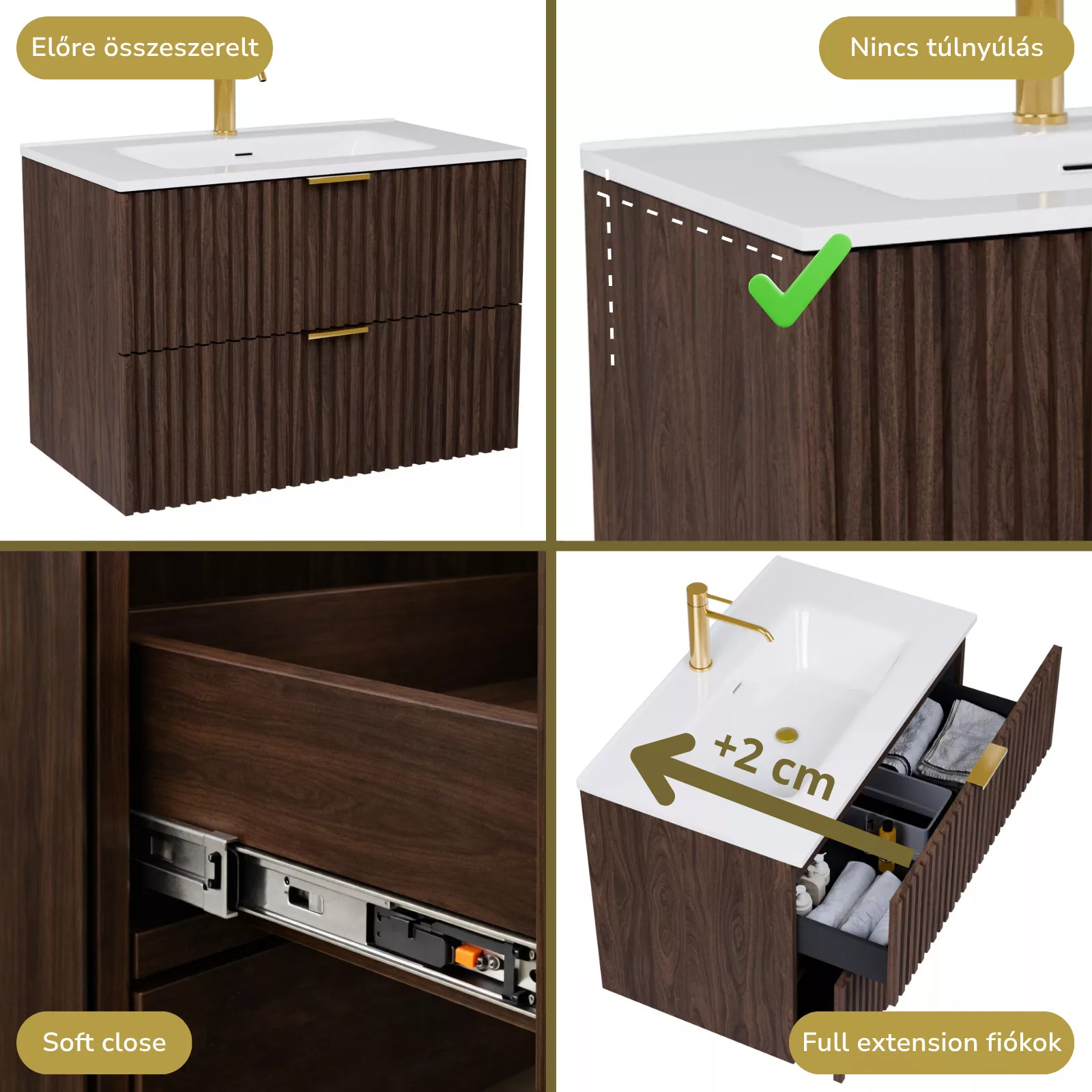 mogyoró színű mosdószerkény, teljes kihúzhatóságú fiókokkal