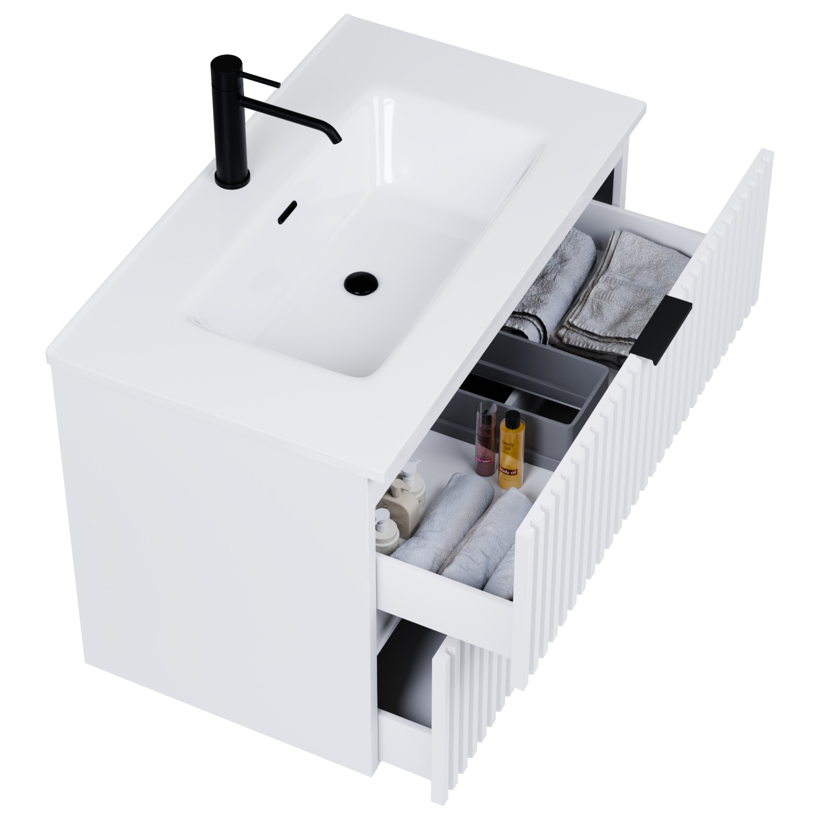 • matt fehér mosdószekrény, teljes kihúzhatóságú fiókokkal