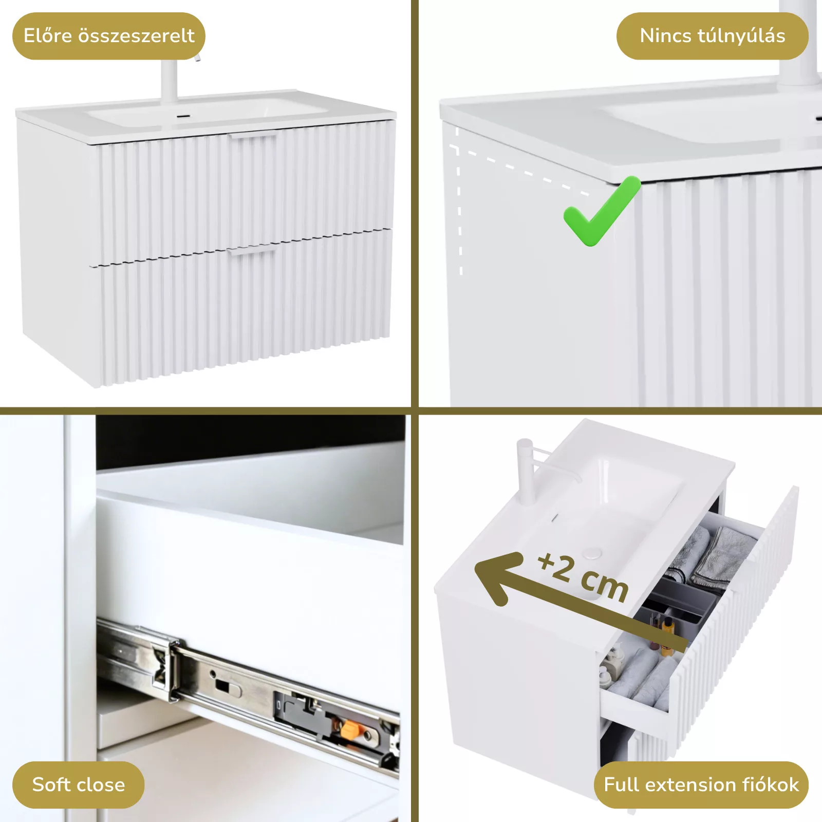 • matt fehér mosdószekrény, teljes kihúzhatóságú fiókokkal
