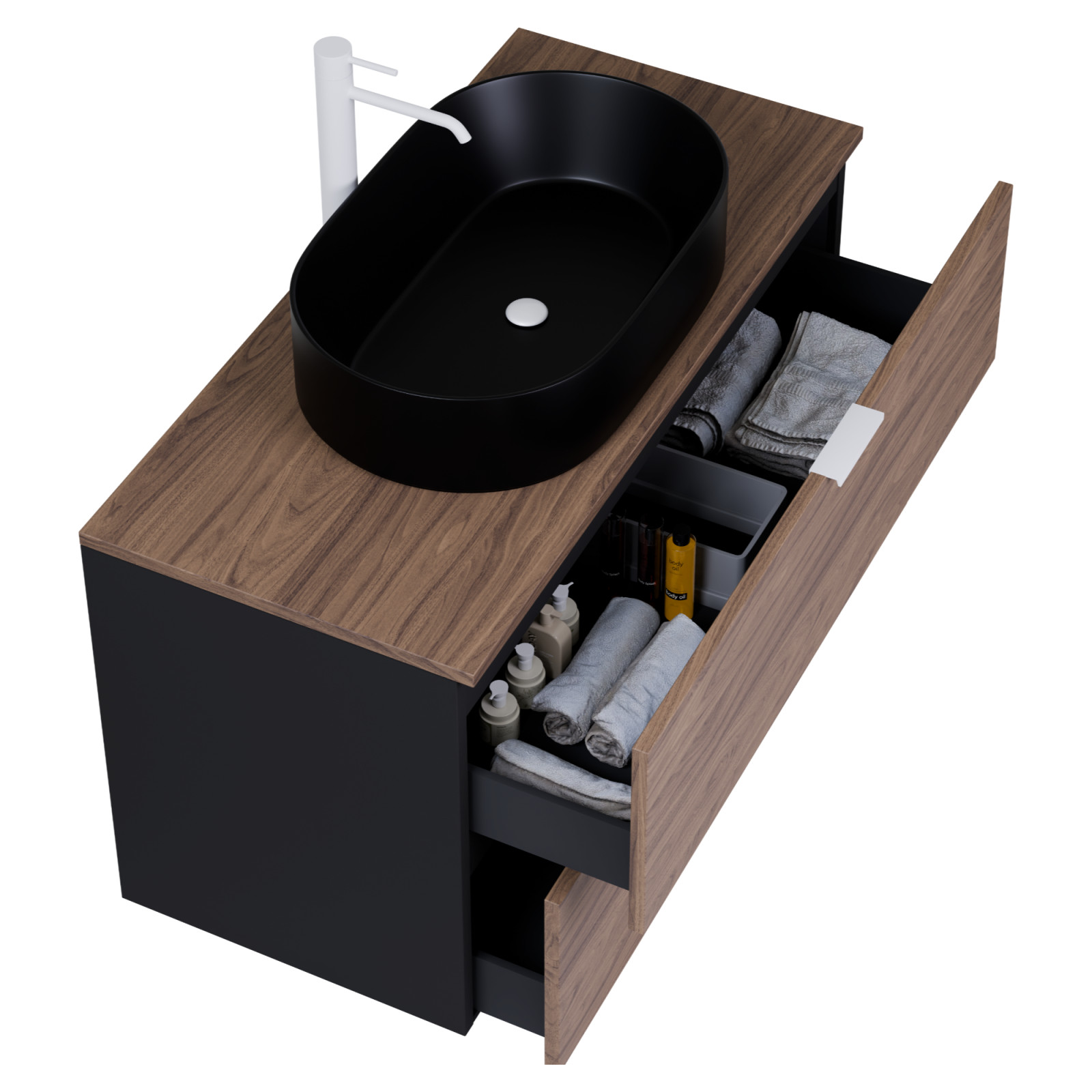 • matt fekete mosdószekrény, teljes kihúzhatóságú fiókokkal