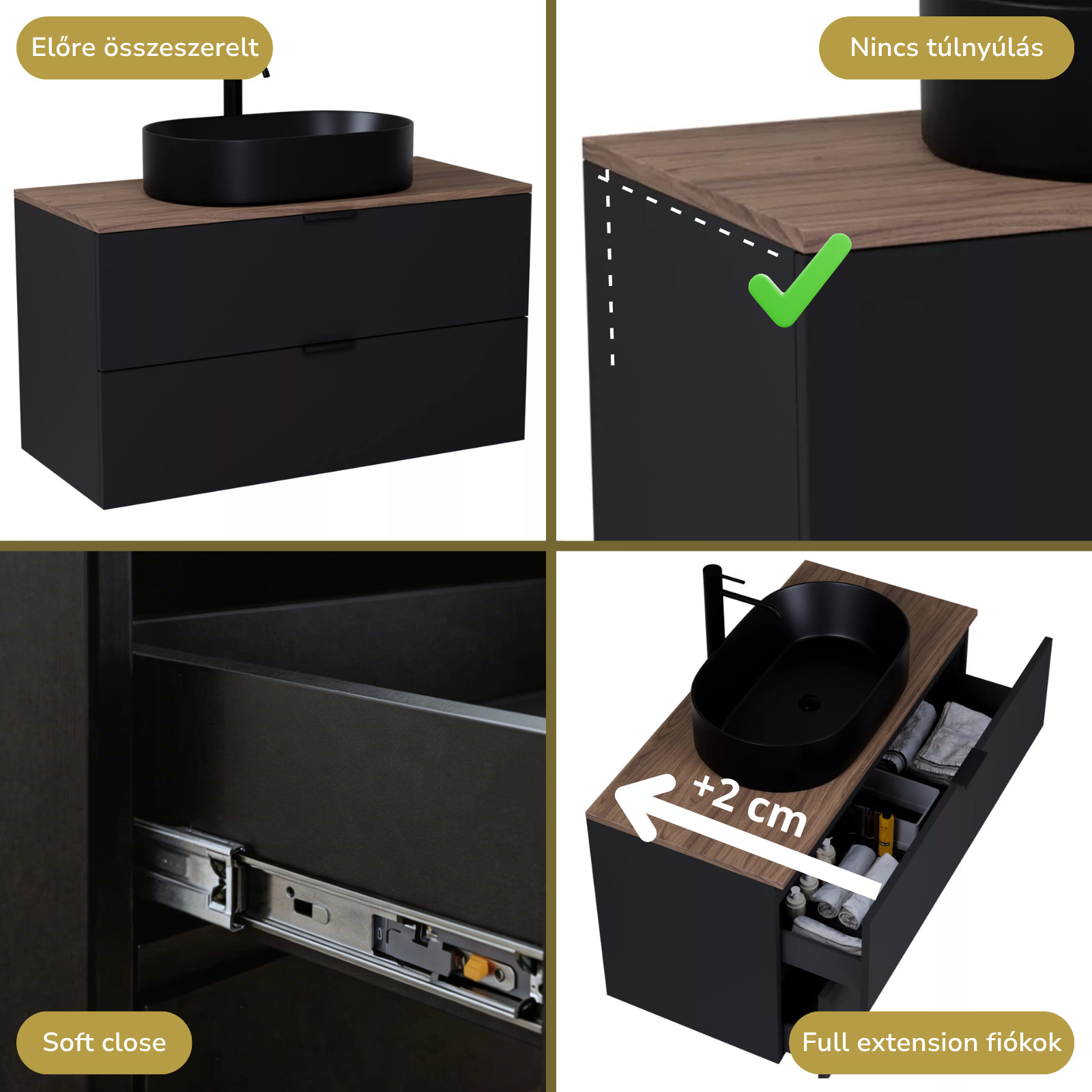 matt fekete mosdószekrény, teljes kihúzhatóságú fiókokkal