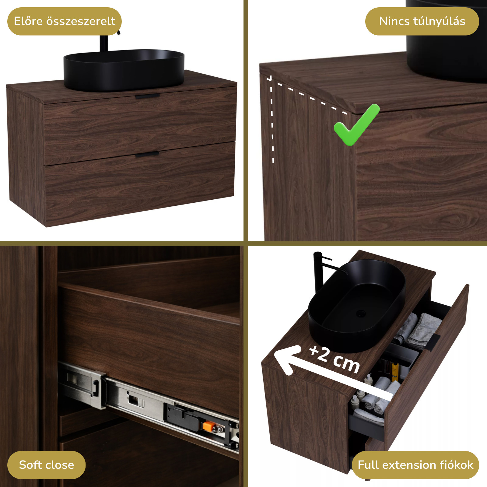 Saját márkás 100 cm széles fali mosdószekrény mogyoró színben, matt fekete fogantyúkkal, mogyoró színű mosdópulttal, rejtett fióksínnel és önbehúzos technológiával ellátott.