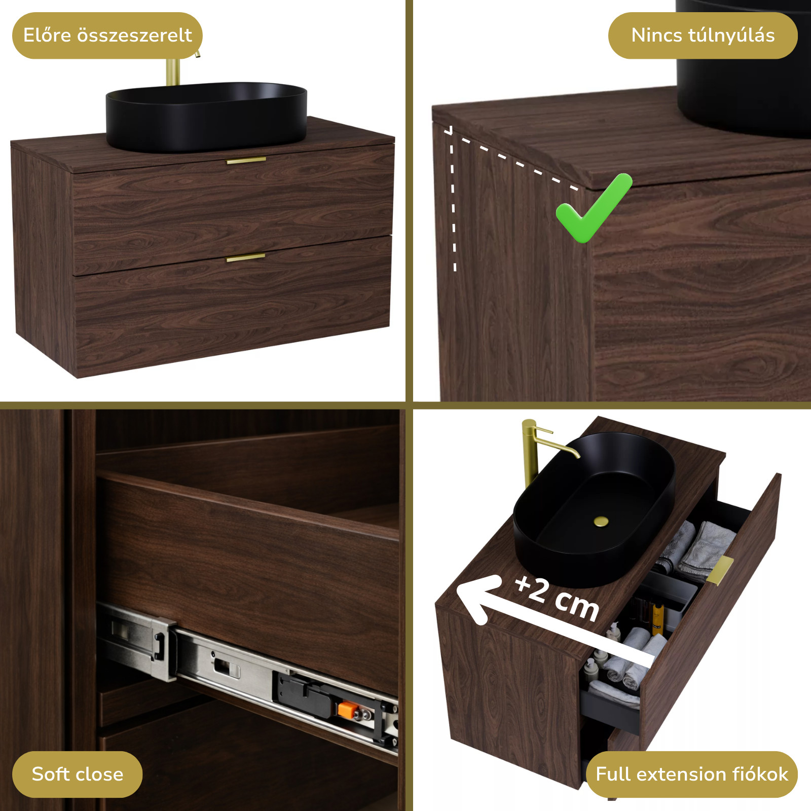 • mogyoró színű mosdószekrény, teljes kihúzhatóságú fiókokkal