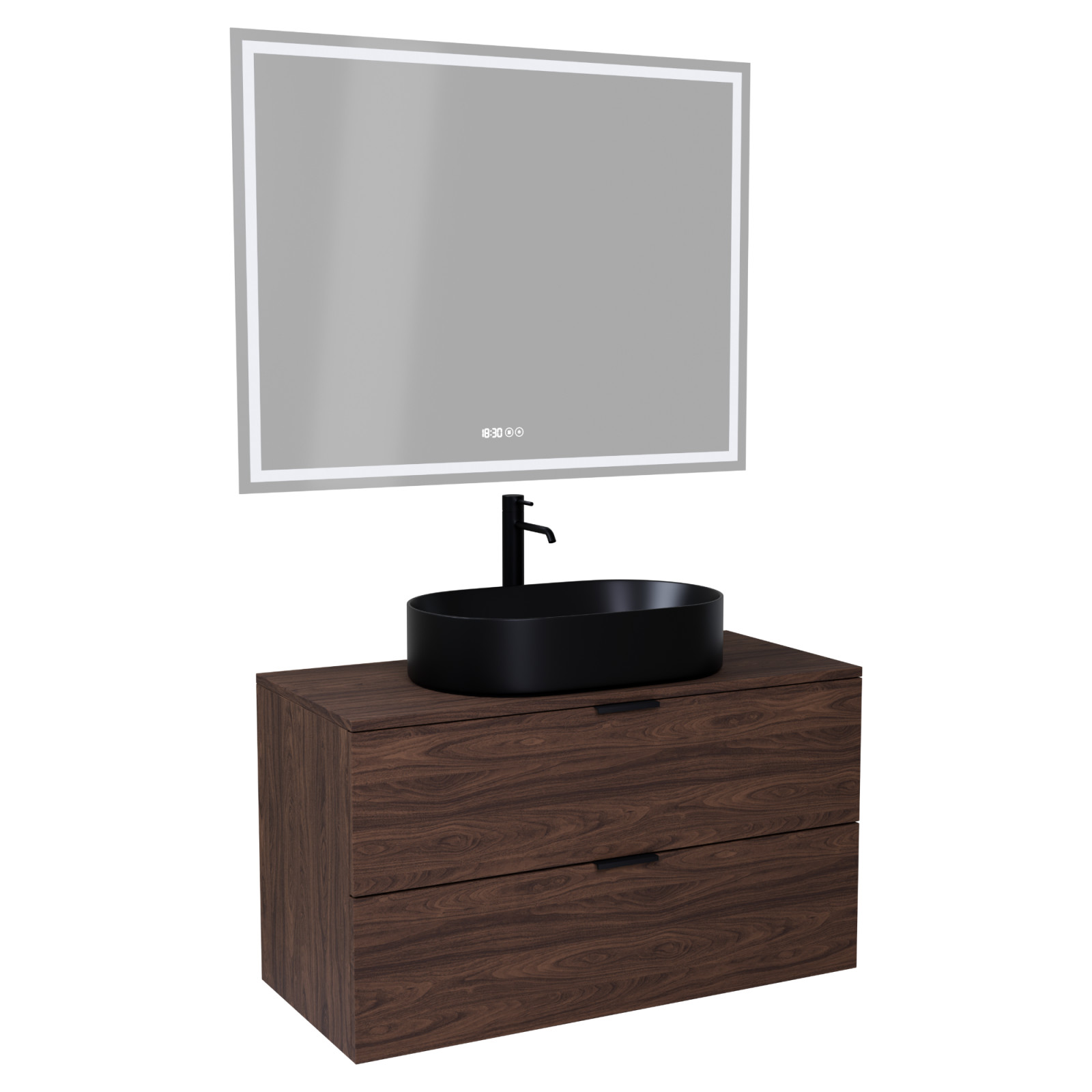 Saját márkás 100 cm széles komplett fürdőszoba bútor fali mosdószekrénnyel mogyoró színben, matt fekete fogantyúkkal, mogyoró színű mosdópulttal és fali okos LED tükörrel.