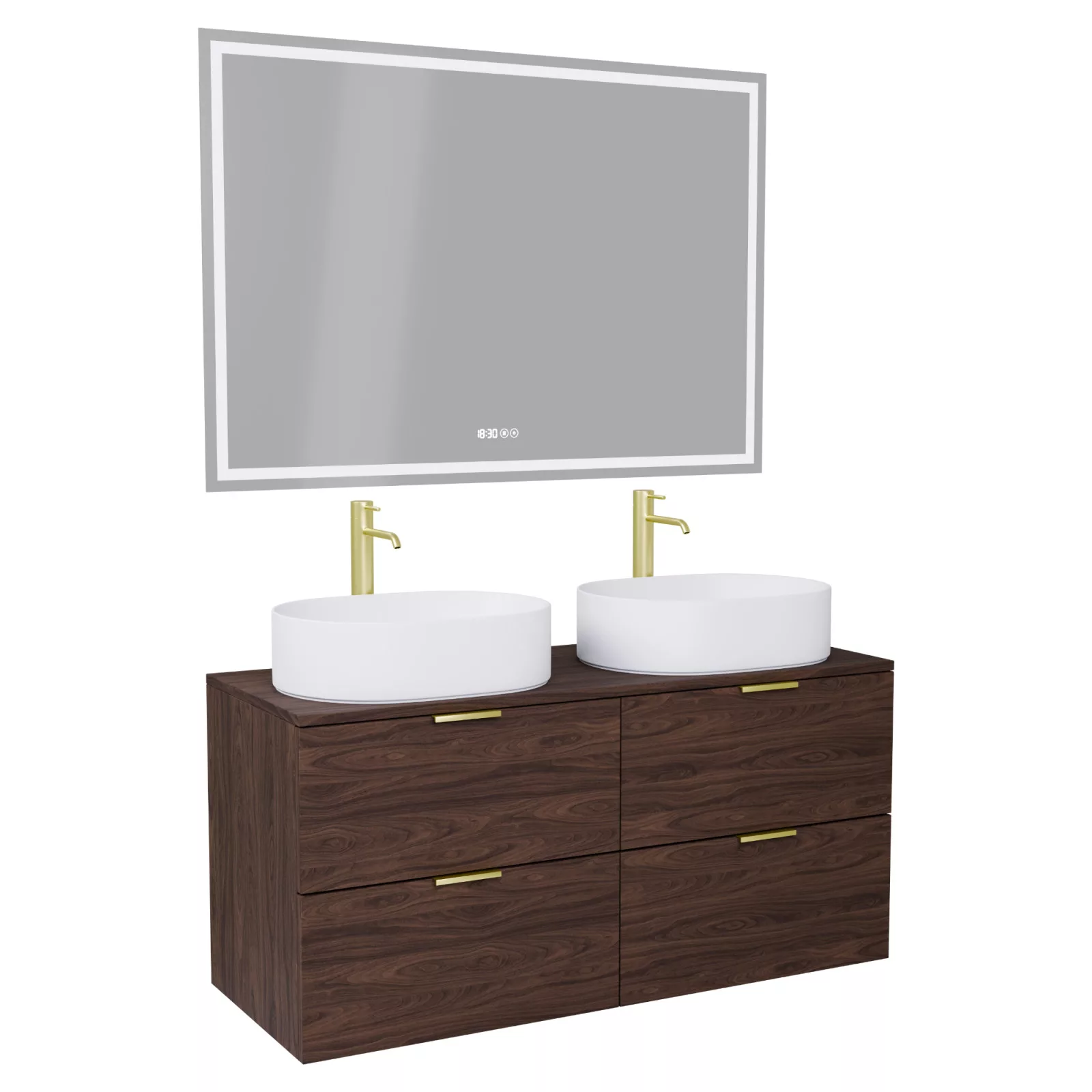 Saját márkás 120 cm széles komplett fürdőszoba bútor fali mosdószekrénnyel mogyoró színben, szálcsiszolt arany fogantyúkkal, mogyoró színű mosdópulttal és fali okos LED tükörrel.