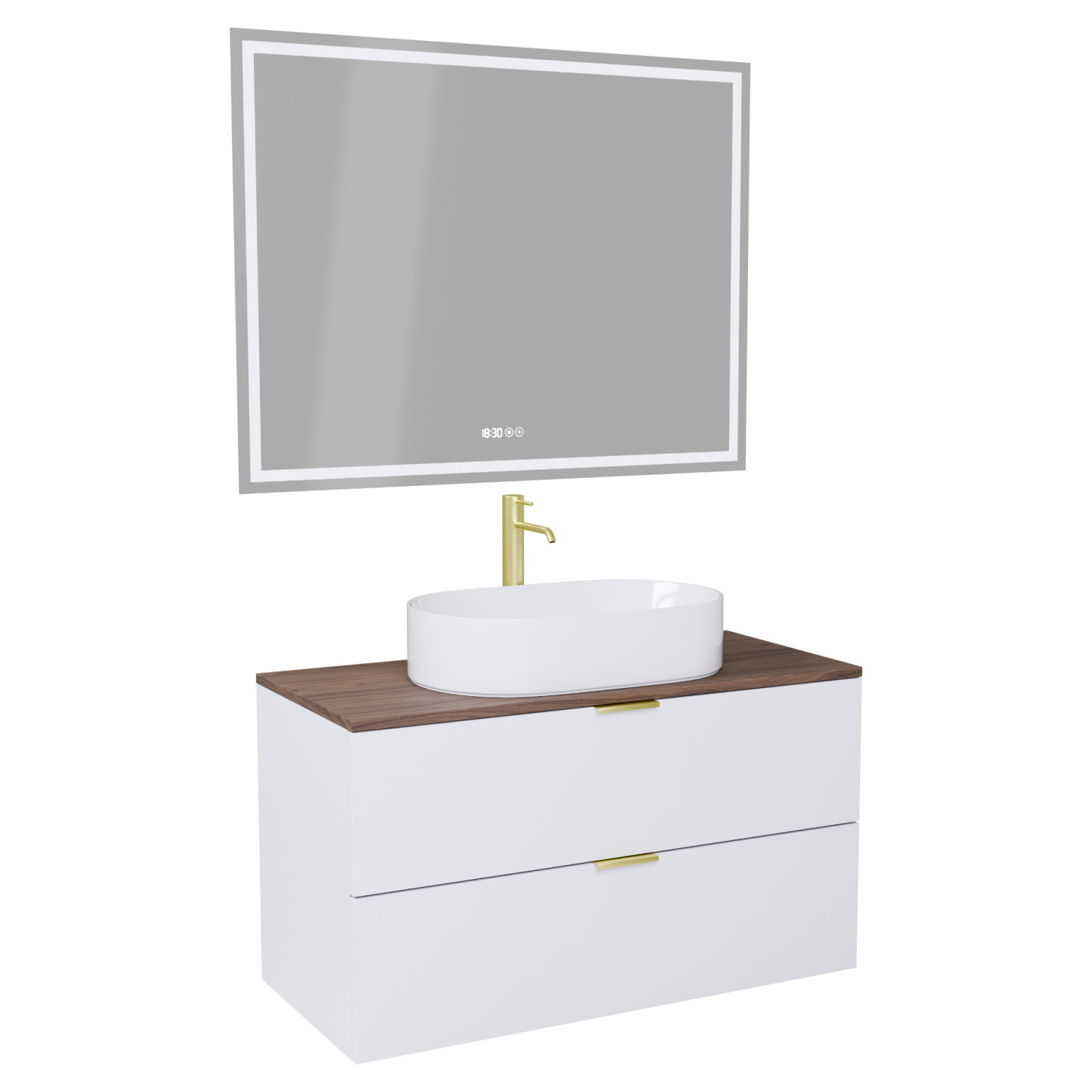 Saját márkás 100 cm széles komplett fürdőszoba bútor fali mosdószekrénnyel matt fehér színben, szálcsiszolt arany fogantyúkkal, tölgyfa színű mosdópulttal és fali okos LED tükörrel.