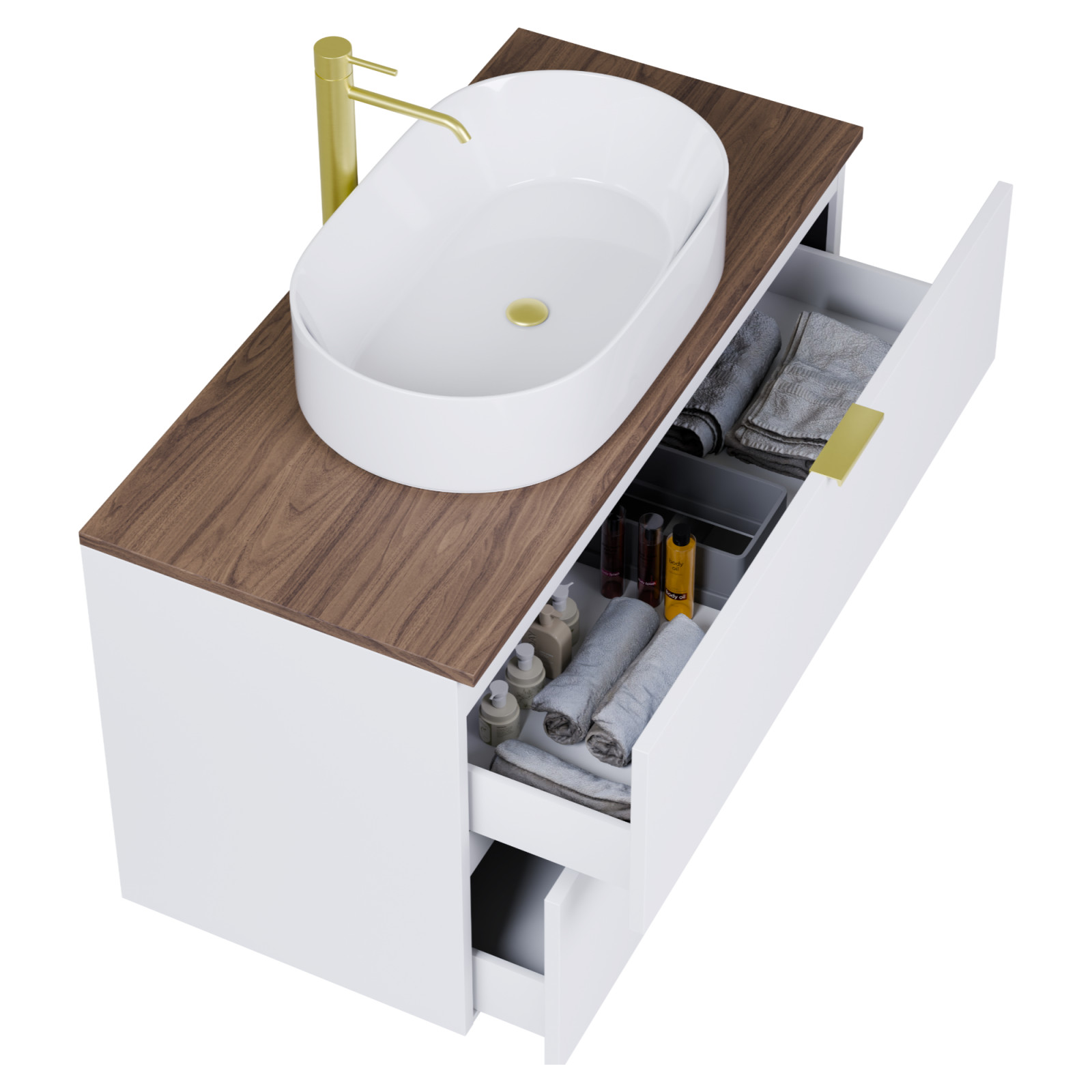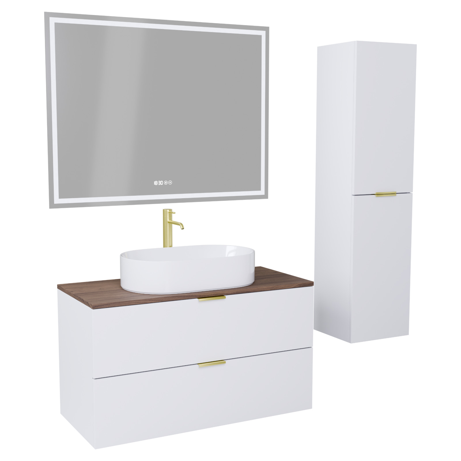 Salerno Matt White 100 komplett fürdőszoba bútor szett, szálcsiszolt arany fogantyúkkal