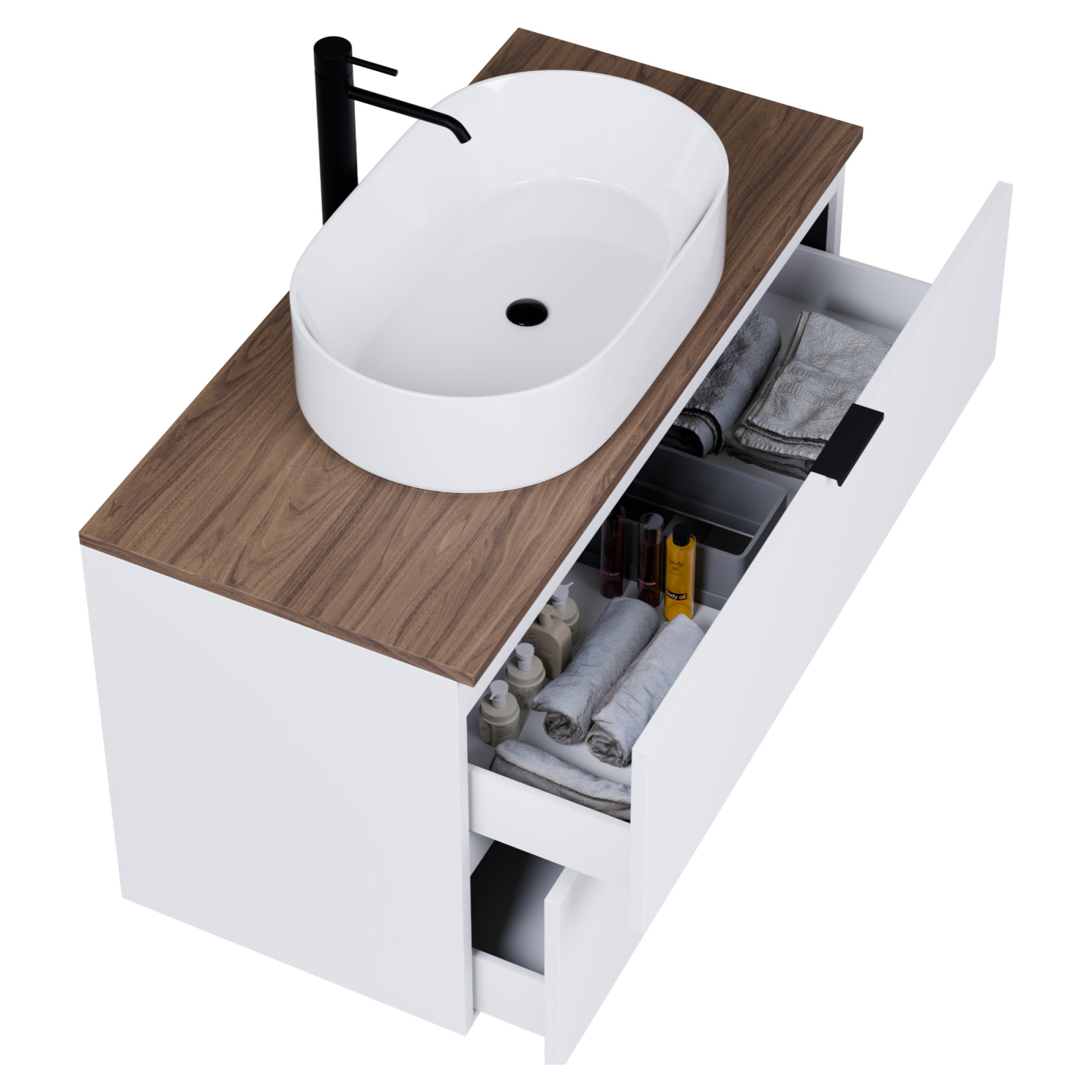 Napjainkban a praktikum mellett a fürdőszoba esztétikus megjelenése is fontos szempont. A függesztett bútorok egyre elterjedtebbé válnak, mivel számos előnnyel rendelkeznek, ide sorolható a modern, könnyed megjelenés és az egyszerű tisztítás . A függesztett fürdőszobai bútorok a klasszikus és modernebb stílusú fürdőszobákban is megállják a helyüket egyaránt. Nagyfokú rugalmasság jellemzi őket, mivel szinte bárhol elhelyezhetők a fürdőszobán belül. További előnyük, hogy soft close (csillapítós) zsanérral felszereltek, így becsukáskor az ajtó vagy fiók finoman záródik be, csökkentve a terhelést és növelve az élettartamot . A szekrény fehér és matt fekete mosdóval, illetve mosdópulttal is szabadon kombinálható ízlés szerint. A teljesség érdekében a mosdószekrényekhez illő LED okostükröt és magasszekrényt is választhatunk, hogy a fürdőszobában lévő bútorok egy szemet gyönyörködtető egységet alkossanak.