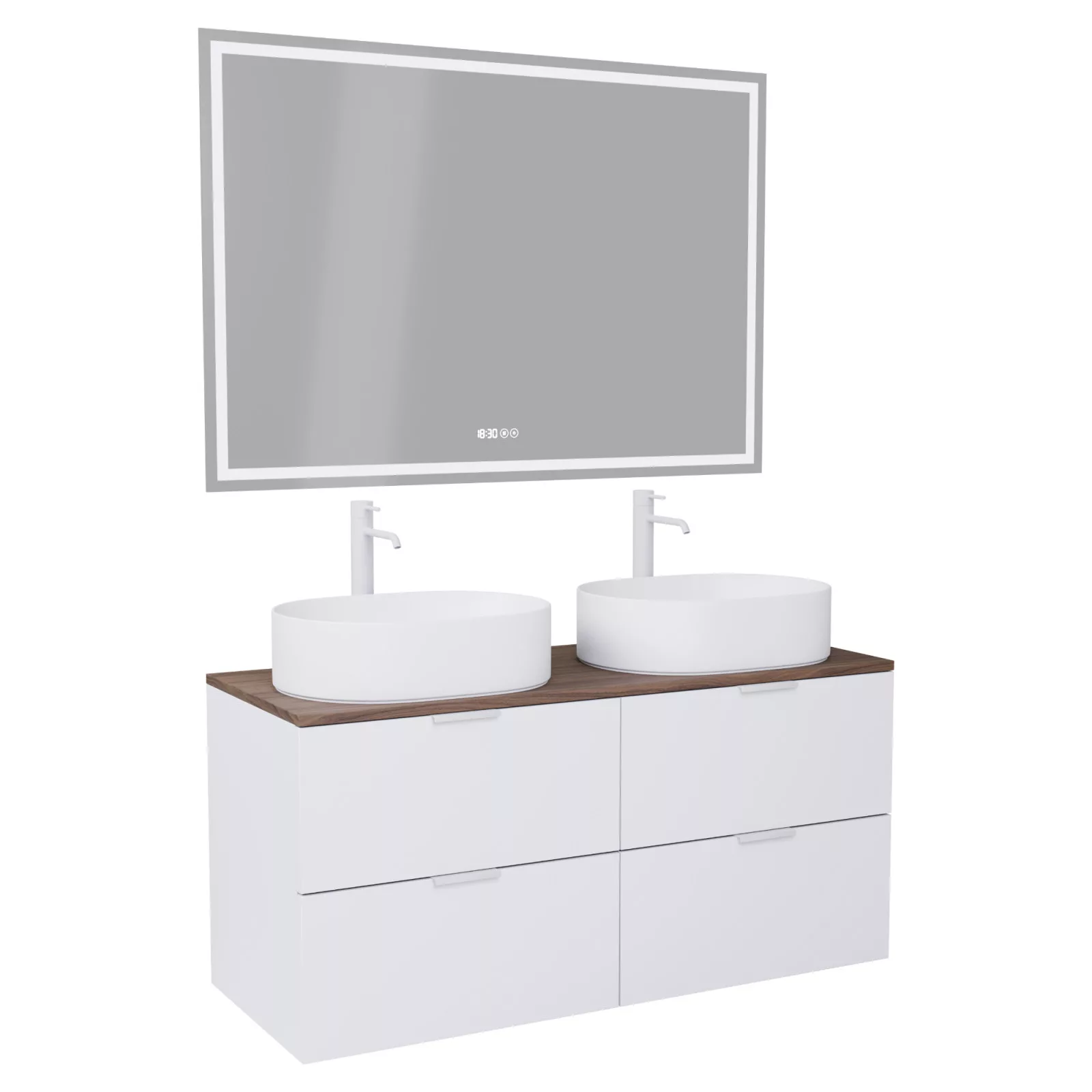 Saját márkás 120 cm széles komplett fürdőszoba bútor fali mosdószekrénnyel matt fehér színben, matt fehér fogantyúkkal, tölgyfa színű mosdópulttal és fali okos LED tükörrel.