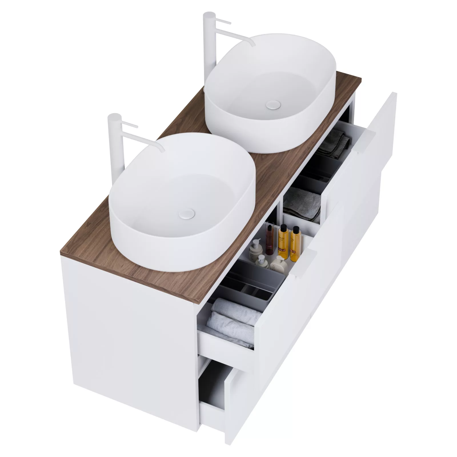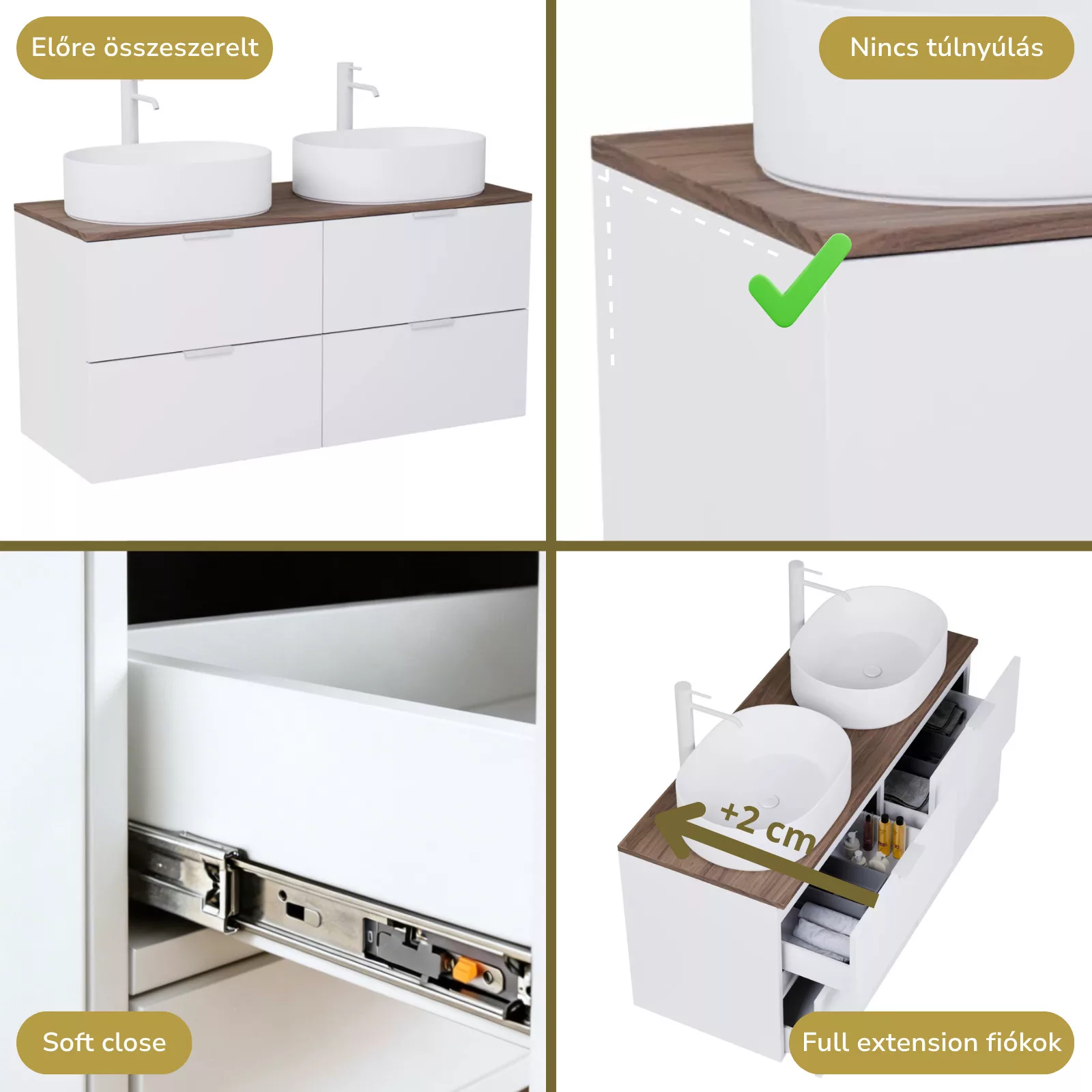 • matt fehér mosdószekrény, teljes kihúzhatóságú fiókokkal
