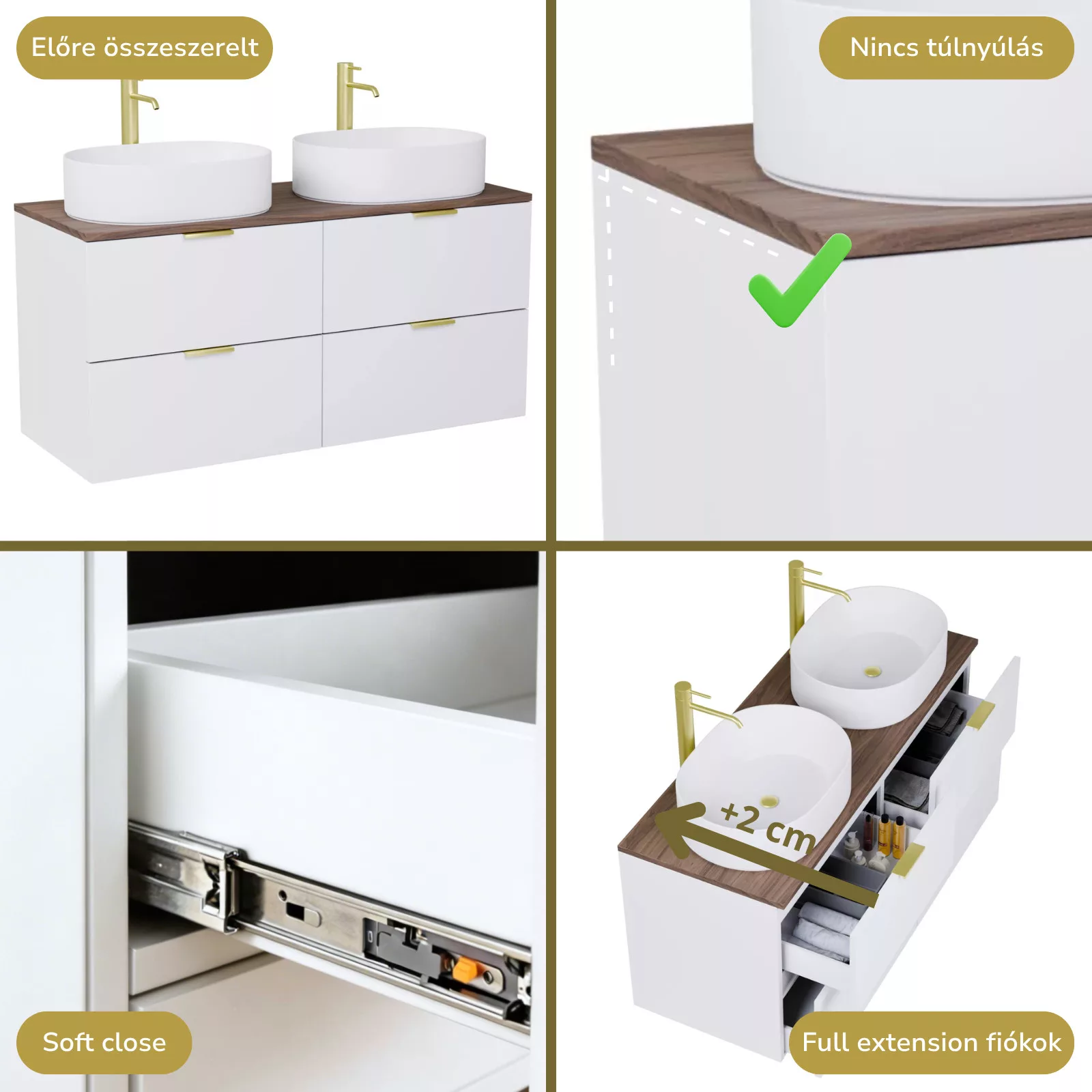 matt fehér mosdószekrény, teljes kihúzhatóságú fiókokkal