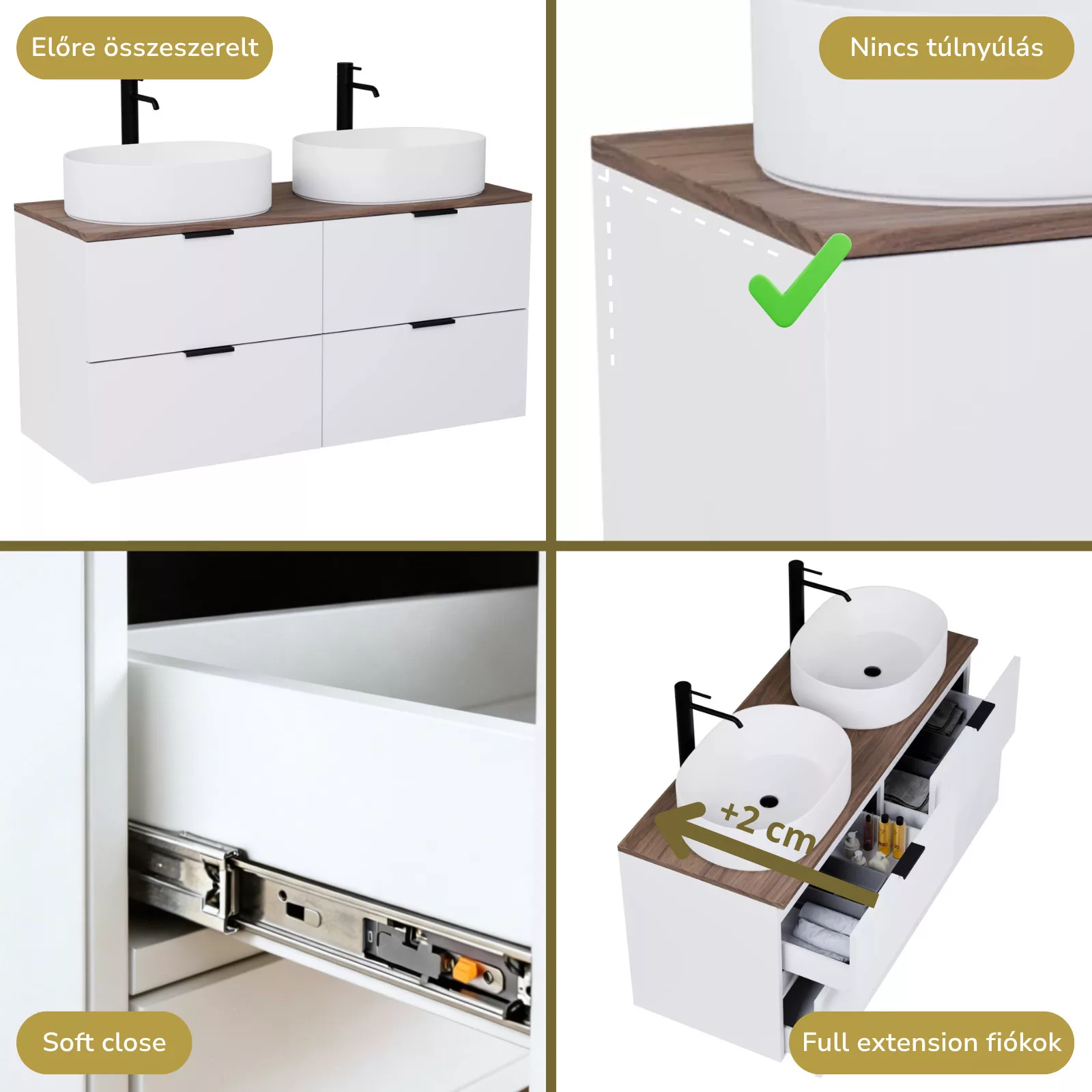 Napjainkban a praktikum mellett a fürdőszoba esztétikus megjelenése is fontos szempont. A függesztett bútorok egyre elterjedtebbé válnak, mivel számos előnnyel rendelkeznek, ide sorolható a modern, könnyed megjelenés és az egyszerű tisztítás . A függesztett fürdőszobai bútorok a klasszikus és modernebb stílusú fürdőszobákban is megállják a helyüket egyaránt. Nagyfokú rugalmasság jellemzi őket, mivel szinte bárhol elhelyezhetők a fürdőszobán belül. További előnyük, hogy soft close (csillapítós) zsanérral felszereltek, így becsukáskor az ajtó vagy fiók finoman záródik be, csökkentve a terhelést és növelve az élettartamot . A szekrény fehér és matt fekete mosdóval, illetve mosdópulttal is szabadon kombinálható ízlés szerint. A teljesség érdekében a mosdószekrényekhez illő LED okostükröt és magasszekrényt is választhatunk, hogy a fürdőszobában lévő bútorok egy szemet gyönyörködtető egységet alkossanak.
