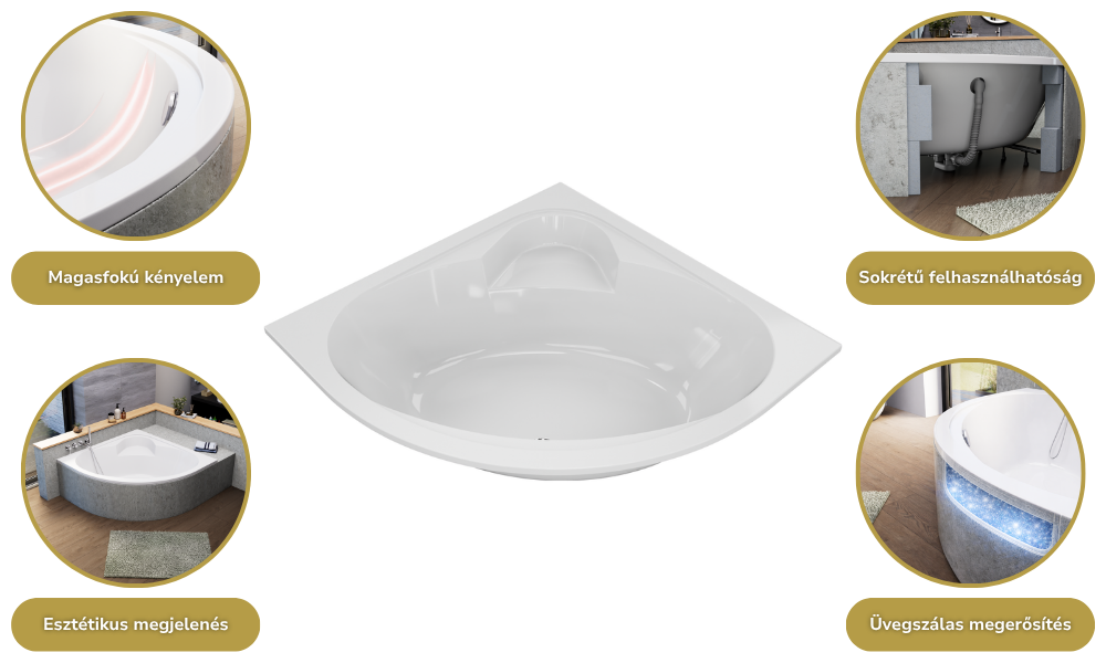 A fürdőkádjaink sokrétű módon felhasználhatóak: burkolható, lábra szerelhető, valamint padlóba süllyeszthető. A fürdőkádhoz tartozó elő és/vagy oldallap könnyedén felhelyezhető.