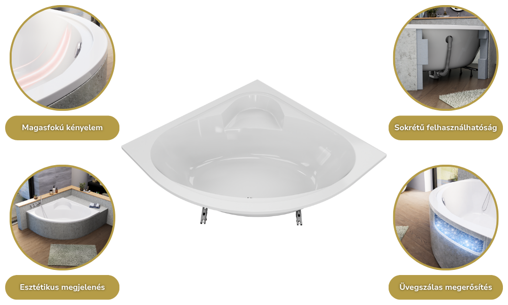 A fürdőkádjaink sokrétű módon felhasználhatóak: burkolható, lábra szerelhető, valamint padlóba süllyeszthető. A fürdőkádhoz tartozó elő és/vagy oldallap könnyedén felhelyezhető.