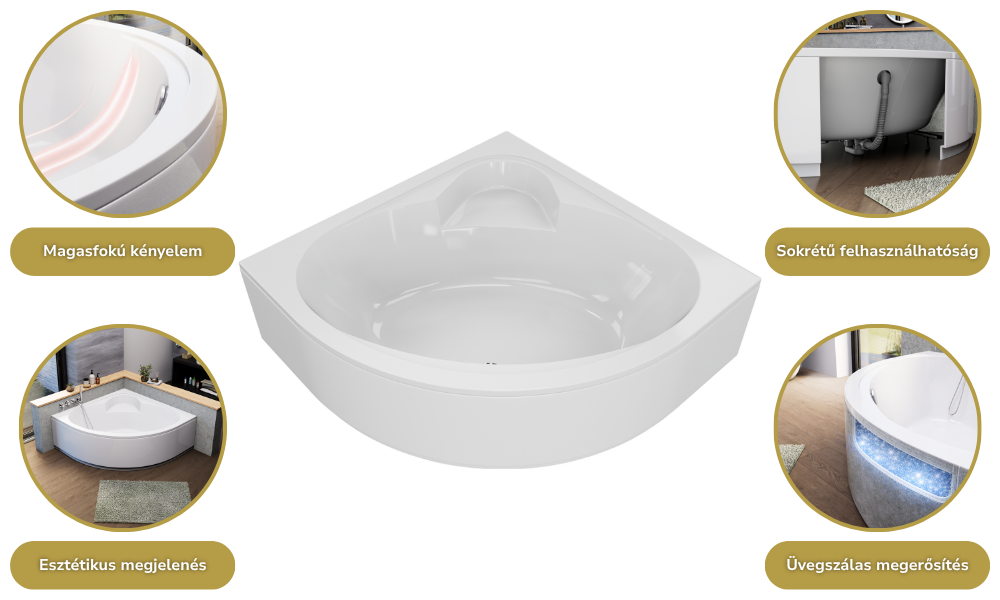 A fürdőkádjaink sokrétű módon felhasználhatóak: burkolható, lábra szerelhető, valamint padlóba süllyeszthető. A fürdőkádhoz tartozó elő és/vagy oldallap könnyedén felhelyezhető.